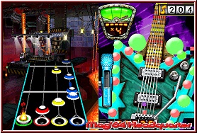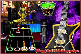 Verzichten müsst Ihr im Gesamten aber auf weit weniger, als zuvor noch angenommen wurde. Der Titel spielt sich ungemein intuitiv und geht bereits nach wenigen Sessions ins Blut über. Wie gewohnt laufen Euch die verschiedenfarbigen Noten auf den entsprechenden Saiten entgegen und müssen im richtigen Moment gespielt werden. Das funktioniert dann mit Hilfe des mitgelieferten Plektrum-Stylus, mit dem Ihr zu jeder Note – vergleichbar bei einer Gitarrensaite – über den Touchscreen schrubbert. So trefft Ihr auch ziemlich schnell alle heran rauschenden Noten, wobei die höheren Schwierigkeitsgrade dann wirklich in die Vollen gehen. Gut, dass ein ausführliches „Training" zur Verfügung steht, in dem Ihr die Basics, aber auch den Einsatz der „Star Power" kennenlernt. Fortgeschrittene Kniffe wie „Hammer-Ons" und „Pull-Offs", die bei Notenserien nur das einmalige Anspielen einer Saite erfordern, beschließen die gewinnbringende Einführungslektion. Und auch die genialen Gitarrenduelle und –schlachten finden wieder statt: und zwar im direkten Duell mit einemFreund. Wie schon auf der Wii stehen Euch hierfür einige Items bereit, die Ihr nach erfolgreichem Spielen einer Notenserie erhaltet. Gerissene Saiten müsst Ihr per Stylus wieder flicken, pyrotechnische Feuerlawinen, die den Bildschirm blockieren, mit einem kräftigen Luftstoß gen DS-Mikrofon löschen. Ebenso können Noten in hochexplosive Bomben verwandelt werden, die dann tunlichst vermieden werden sollten. Verstärkte Notenfolgen, aber auch vor Items schützende Schilde verhelfen zu besseren Ergebnissen. Auch nett: „Hypergeschwindigkeit" lässt das Geschehen zum wahren Geschwindigkeitsrausch verkommen, der vollautomatische Bildschirmwechsel stiftet Verwirrung und macht eine Neuorientierung vonnöten. Nicht gerade einfach ist es, den Takt zu halten ohne dass Musik das Geschehen bereichert. Da mutet die Unterschriftenaktion während des Songs schon wie ein Schäferstündchen an: Setzt Euer Gitarrenpartner jenes Item ein, reicht Euch ein Fan ein zu signierendes Objekt, dass Ihr nun unterschreiben müsst. Was sich die Entwickler nicht so alles einfallen lassen… Leider haben sie sich keine neuen Features ausgedacht, Ihr werdet also ein drittes Mal (!) mit der altbewährten Schose konfrontiert.