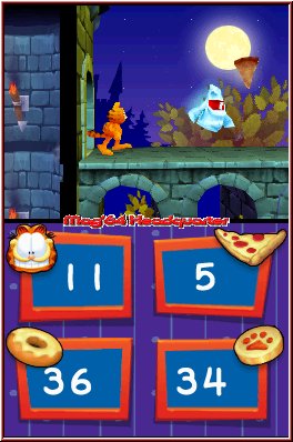 Wie nur wenige Entwickler bietet Shinen wieder zig Sprachen zur Auswahl, die natürlich auch Deutsch enthalten. Ebenso passend für die Zielgruppe ist der Autosave der Spielinhalte, so das die auch hier angepeilte jüngere Zielgruppe unbeschwert loslegen kann. Mit Minispielen ausgestattet allerdings ein Spiel für eine Person. Diesmal sorgt eine Pseudostory für den thematischen Hintergrund des Spiels. Garfield dem mal wieder etwas langweilig ist weiß noch nicht so recht wie er seine Zeit vor dem Schlafen gehen über die Runden bringen soll. Was liegt da bei ihm näher als sich mal wieder mit Lasagne vollzustopfen. Diesmal hat seine Fressorgie aber schlimme Folgen und der Schlaf sollte mehr als Unruhig werden. Alpträume sorgen für eine unruhige Nacht. Just an diesem Punkt steigt Ihr als Spieler ein und sollt ihm doch noch zu einer ruhigen Nacht verhelfen um am Ende jedes Levels einen Teil des Weckers zu finden, mit dem er wieder in seine Welt zurückkehren kann. Spielerisch erlebt Ihr diese Alpträume und lenkt in diesen die Geschicke des kleinen Garfield.