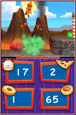 Beginnt Ihr ein neues Spiel wird die Story anhand nett gemachter gezeichneter Bilder dargestellt. Schlußendlich startet der erste Alptraum des Spiels, den man hier auch einfach gesagt als Welt bezeichnen kann. 4 Welten warten im Spiel auf den Spieler. In verschiedene thematische und damit grafische Umgebungen gepackt ist der Ablauf dabei immer gleich. Jede Welt bietet im gesamten 5 Level, wobei 4 normale Level am Schluß mit einem Boss Abschnitt abgeschlossen werden. Dabei muß der Spieler strikt die Reihenfolge einhalten und spielt also Level 1.1, 1.2 u.s.w. Leider bietet das Spiel keinen Level Wechsel, so das man alte Bereiche nochmal spielen könnte. Eine Schwäche des Spiels, da der Abenteuer Modus an sich keinen Wiederspielwert bieten sollte. Man zockt einmal durch und das wars dann auch. Spielerisch ist Garfields Nightmare das was man heutzutage als bodenständigen 2D Jumper bezeichnen würde. Soviele gibt es davon kurioserweise garnicht auf dem DS. Denn die Mario Spiele z.b. als simple 2D Jumper zu bezeichnen wäre ja fast schon eine Beleidigung. Nicht nur deshalb richtet sich auch dieses Game an die jüngere Zielgruppe auf dem Nintendo DS. Startet ein Level ist es immer das Ziel am Ende einen Endpunkt zu erreichen und anzuspringen um das Level zu beenden. Bis dahin wartet gewohntes Jumper Gameplay, das Shinen like allerdings technisch sehr gehobenes Niveau besitzt. Die Aufteilung der Screens ist ebenfalls klar abgegrenzt. Abseits der Minispiele, die über den Touch Screen gesteuert werden, geht es im Abenteuer Modus auf dem Top Screen zu. Hier wird der Touch Screen rein für Info Zwecke genutzt und nichts anderes. Dabei beläßt man es in Sachen Aktionsvielfalt bei dem was diese einfachen Jumper auszeichnen.