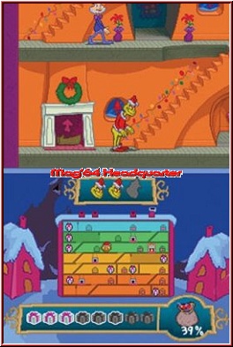 Der Grinch als zu steuernder Charakter hat bedauerlicherweise keine großartigen Fertigkeiten vorzuweisen, um den Spieler beeindrucken zu können. Logisch, er kann sich gehenderweise fortbewegen, weiterhin gelingt es ihm seinen mitgeführten Geschenksack gelenkig über die Schulter zu werfen und somit den Schein von Weihnachten geschickt im baumwollenen Behältnis sprichwörtlich einzusacken. Jedes Haus, in welchem sich der Grinch bewegt gleicht den anderen von der Gestaltung her. Allerdings ist der Aufbau ein anderer. Nicht nur Treppen befinden sich je nach Villa an anderer Stelle, auch die Kaminschächte, die vom Grinch als Aufzüge "missbraucht" werden. Auf jeder der Ebenen patrouillieren die Bewohner des Hauses, beispielsweise die kleine Cindy Lou Who, die nachtwandlerische Schlafwandel-Oma oder der so genannte Wach-Who, der mit späherischen Äuglein nach dem Weihnachtsmann Ausschau hält und über die Gänge huscht. Selbstverständlich müsst Ihr den Bewohnern ausweichen, was bedeutet, dass Ihr geschickt Treppen nutzt oder Euch in Kaminschächten und sonstigen Ecken versteckt. Um das gesamte Haus vom weihnachtlichen Schmuck zu befreien, solltet Ihr das komplette Anwesen erkunden, jede Ebene auskundschaften, jeden Winkel von Girlanden, Weihnachtsbäumen und ausgepackten Geschenken "säubern". Jede Dekoration entspricht dabei einem bestimmten Prozentsatz - somit seid Ihr bestrebt, möglichst alle Kleinigkeiten, die auch nur im Entferntesten an Weihnachten erinnern, mitgehen zu lassen. Grinchs Aufgabe, den Whos das Fest zu stehlen gelingt nur, wenn Ihr insbesondere die grünen Geschenkpakete abgreift - je nachdem für welchen Schwierigkeitsgrad Ihr Euch entschieden habt, eine andere Anzahl. Es gilt also, sich an den Whos vorbei zu schleichen, die Inneneinrichtung zu neutralisieren und schlussendlich durch den Kamin wieder in's Freie zurückzukehren.