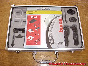 Mit dem „Ultimate Player Kit“ (13 in 1) von „Hama“ habt Ihr die unmissverständliche Komplettlösung für das Spielerherz. Der Alukoffer (verschließbar, vier kleine Plastikfüße) samt großem Sichtfenster aus Plastik gewährt Euch ein Sammelsurium aller nur erdenklichen Ausstattungs-Goodies. Speziell dafür vorgesehene Vertiefungen sorgen dafür, dass der Nintendo DS hervorragend Platz auf Reisen findet. Vier beiliegende, aufklappbare Plastikhüllen für Spielkarten sind ebenso im Set enthalten.