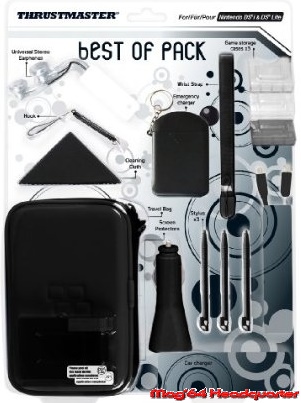 Rosa und Schwarz wird es im Zubehör-Segment. Thrustmaster sei Dank! Das „Best of Pack“ bietet so ziemlich alles, was das Herz eines Zubehör-Fetischisten wünscht. Euer Nintendo DSi/DS lite wird durch vorliegendes Produkt bestmöglich ausgestattet, aufgewertet, optimiert. Ganze 14 Accessoires befinden sich im Set. In das Hartschalenetui wird der Handheld gelegt, Handgelenksschlaufen sorgen dafür, dass man diesen auch jederzeit mit sich führen kann. Des Weiteren befinden sich Stereoohrhörer im Set sowie ein Zigarettenanzünder, der Euch den Doppelbildschirm im Auto „auftanken“ wird. Ein Notfallladegerät, das mit 4 AAA-Batterien arbeitet, ist ebenso enthalten, so dass selbst bei leerem Akku einige Stunden weitergespielt werden darf. Screen-Protektoren, ein Reinigungstuch, drei Spieleaufbewahrungsetuis sowie drei Zusatz-Touchpens warten auf Ihren Einsatz. Zwar ist das Set nicht ganz billig, immerhin kommt aber jedes Zubehör in einem einheitlichen Farbton daher (übrigens gibt es weitere Farbvarianten zu kaufen!). Das „Best of Pack“ kann sich daher – trotz anständigen Preises – sehen lassen.