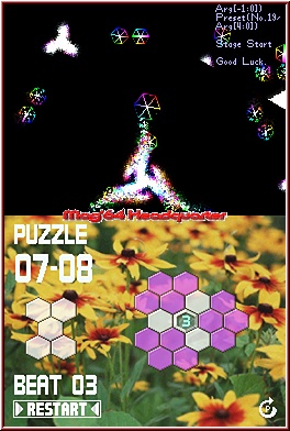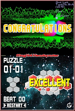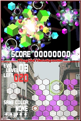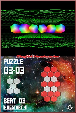 Was Ihr bei "Honeycomb Beat" zu tun habt, ist von der Erklärung her gar nicht so einfach: sechseckige Waben sind das Grundgerüst des Titels, wobei jede Wabe zwei Farben besitzt (auf jeder Seite eine). Dieser Farbenwechsel geschieht durch eine Berührung mit dem Touchpen. Nicht nur die gerade eben berührte Wabe wird dadurch gewendet, sondern auch die umliegenden Sechsecke. Letztendlich ist der "Puzzle-Modus" so ausgelegt, dass alle Waben die weiße Farbe zeigen müssen, um den Level erfolgreich verlassen zu können. Wegen der teils recht kompliziert angeordneten Wabenansammlungen erweist sich dieses Vorhaben als ungemein komplex, denn man sollte immer bedenken, dass die vielleicht bereits in der korrekten Farbe dargestellten Farben nebenan durch eine Touchscreen-Berührung jederzeit geswitcht werden können.
