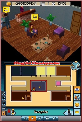 Die Navigation im Hotel ist ganz einfach gestaltet. Auf den Touchscreen hat man den Grundrissplan des Hotels gelegt, der alle Räume in der Draufsicht zeigt und wenn man einen Raum markiert, erschein im oberen Bildschirm der Raum im Detail. Unter dem Grundrissplan erscheint dann auch die Bezeichnung des Zimmers, zum Beispiel, Zimmer für 1 Person, Bibliothek, Geschäft oder die Hochzeitssuite. Links daneben symbolisiert der Liftboy den Aufzug, der uns in jede Etage bringt. Rechts in der Ecke sehen wir eine Gästefigur, die weitere vier Punkte verbirgt. Mit dem Augensymbol gelangen wir wieder in die Grundplanansicht, die zwei Personen stellen unsere Gästeliste dar, das Goldstück beinhaltet die Budgetübersicht und die Krone die Spielziele. Das runde Symbol oben rechts auf dem Touchscreen ist das Bau- bzw. Umgestaltungsmenu. Hier gehen wir hin, wenn Räume gebaut oder in ihrer Einrichtung verändert werden sollen. Das Umgestalten der öffentlichen Räume, wie die Rezeption, die Bibliothek oder der Nachtbar, kann man am Topscreen mitverfolgen, was sich ändert. Die Änderungen erfolgen natürlich über den Touchscreen. Am Beispiel der Rezeption will ich es euch einmal näher erläutern. Die verfügbaren Accessoires werden in der obersten Reihe angezeigt, während darunter die Bezeichnung steht und wie viele man davon kaufen kann. Die Ausstattung dieser Gegenstände symbolisieren die Sterne neben dem Kaufpreis. Je mehr Sterne, desto luxuriöser dieser Gegenstand und natürlich umso teurer. Mit Hilfe die Buchstabengruppe arrangiert man den Raum komplett um.