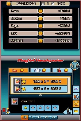 So rüsten wir jeden Tag unser Hotel ein wenig mehr auf und ändern die Preise der Zimmer oder des Restaurants. Stellen Putz- und Reparaturteams ein und statten unser Haus mit Sicherheitsleuten aus. Wenn sich ein Problem im Hotel ergibt, eilen diese fleißigen Helfer von allein los und beheben den Schaden. Wer dafür kein Geld ausgeben will, kann das natürlich selbst erledigen. In Problemzonen erscheinen kleine Blitzsymbole, die wir per Touchscreen erreichen. Berühren wir den Blitz, wird und eine Bewegung angezeigt, die wir mit dem Pen ausführen sollen, damit das Problem sich löst. Doch wenn man ein großes Hotel hat, in dem viele Leute abgestiegen sind, kommt man zu nichts anderem mehr, als durch das Haus zu wuseln und zu putzen. Doch bleibt es zu lange dreckig, maulen die Gäste auch wieder. Also stellt man fachkundiges Personal ein, die zwar Geld kosten, aber unser Leben ein gutes Stück ruhiger machen.