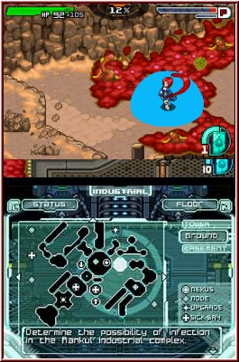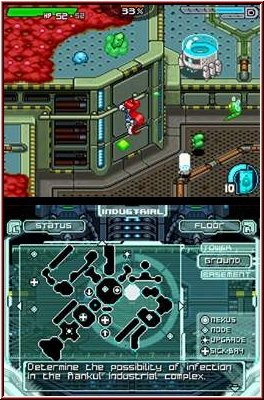 Allein bei der Tastenbelegung merkt man schnell das sich GBA und DS Version inhaltlich und spielerisch nicht unterscheiden. Denn neben identischer Tastenfunktionen sind hier z.b. X und Y nicht belegt. Wirklich eintauchen in das Spiel tut Ihr aber erst ab dem Zeitpunkt, wo Jenosa den Planeten Inos und damit die Hauptlocation betritt. Hier kommen nun weitere Dinge dazu. Wichtigster Punkt ist Ihr Anzug, der gegen den Virus nicht komplett immun ist. Mittig oberhalb im Top Screen habt Ihr dazu eine Prozentanzeige, die euch anzeigt wie hoch der Grad der Vergiftung ist. Erreicht diese Anzeige 100% verliert Ihr stetig Energie bis Ihr ganz draufgeht. Um dies zu verhindern bietet das Spiel innerhalb der Locations sogenannte Entgiftungsstationen, die wie alle wichtige Orte auch auf den Karten angezeigt werden. Springt man auf diese Stationen und drückt die A-Taste wird die Anzeige auf 1% runtergefahren und das Spiel gespeichert, was eben immer nur hier geht. Geht Ihr von der Station herunter beginnt der Vergiftungsprozeß immer wieder neu. Das heißt Aufgaben und das Vorankommen wird und muß immer unterbrochen werden um Jenosa zu entgiften. Klingt sehr hektisch, ist aber nicht ganz so schlimm wie es klingt. Zum einen sinkt die Lebensenergie bei 100% nicht so schnell, als das man nun keinerlei Chance mehr hat eine Entgiftungstation zu erreichen. Zum anderen sorgen Level Up für steigende Energiewerte und Gegner hinterlassen nach dem Ableben Pickups, die eure Lebensenergie auffrischen. Rumtrödeln sollte man aber im Gegenzug auch nicht gerade. Zweiter wichtiger Punkt sind die sogenannten Schlüsselkarten. Einfach gesagt besteht das Spiel aus einzelnen Räumlichkeiten, die mal mehr oder weniger umfangreich sind. Im gesamten bieten Scurge Hive auch auf dem DS über 350 davon. Viele allerdings sind bei weitem nicht sofort begehbar und werden durch Türen mit einem Zahlenwert versperrt. Ihr wiederum müßt Ihr diese Zahl in Form von solchen Schlüsselkarten finden. Steht also an einer gesperrten Tür die Zahl 6, müssen 6 dieser Karten her, die unten rechts im Screen auch angezeigt werden.