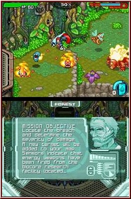 Auch in Sachen Grafik sucht man die Unterschiede zur GBA Version eigentlich mit der Lupe. Denn bis auf den leicht größeren Screen ist der Rest komplett wie auf dem GBA. Spielt man beide Games auf dem Lite ist auch die Farbpower die gleiche. Die Iso Sicht bietet die Möglichkeit viele räumliche Details darzustellen und tut dies logischerweise auch auf dem DS. Vor allen die verschiedenen Location können hier punkten. Dazu kommt das vieles in den Locations animiert ist. Auch die Designs der Gegner sind einem Spiel wie diesem angemessen. Vor allem die Boss Gegner zeigen viel Kreativität der Entwickler und sind nicht nur in Bereich Kampf gut gelungen. Die Animationen der Heldin sind zwar ordentlich, leben aber auf der anderen Seite auch oft von ihren langen roten Haaren. Im gesamten wäre sicher hier und da aufgrund der DS Power mehr drin gewesen, dennoch kann man der grafischen Gestaltung schon etwas abgewinnen. Ansonsten muß man sich auch beim Thema Kollisionabfrage oder Genauigkeit beim Waffeneinsatz keine Sorgen machen. Beim Sound unterhalten euch viele Computermäßig angehauchte Stücke, die sehr gut zu den Locations passen und oft wechseln. Angepaßt nach Location und vor allem Spielsituation gibt es viel Abwechslung. Dazu reichlich Effekte der Waffen, so das Ihr auch hier immer genau wißt was Ihr gerade tut.