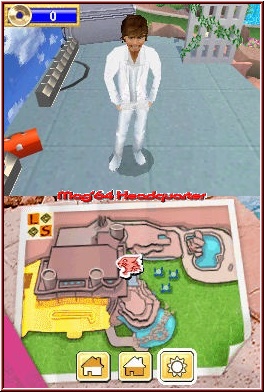 Manövrieren könnt Ihr Eure Spielfigur über das Steuerkreuz, oftmals erkundet Ihr die Anlage oder müsst eine „Krisensituation" meistern – innerhalb eines Bereichs ist dann Not am Manne und Ihr sollt herausfinden, um was es sich hierbei dreht. Unterhaltsam gelöst ist die Sache mit der Jukebox: Alle Songs können dort nach Belieben abgespielt werden – auch dann, wenn der Handheld geschlossen ist. Apropos Songs: Da Ihr im Laufe des Spieles diverse Lieder einüben werdet, gilt es Notenblätter einzusammeln, die im Besitz der anwesenden Personen im Club sind. Bei den nun folgenden Tanzproben gilt es im rechten Moment mit dem Touchpen auf erscheinende Symbole zu tippen, aber erst dann, wenn der äußere Kreis eine grüne Farbe eingenommen hat. Erst zum Abschluss eines Tages wird dann das gesamte Lied vorgeführt. Je besser Ihr abschneidet, desto höher ist auch der von Euch erreichte Rang.