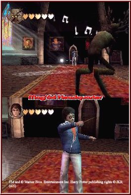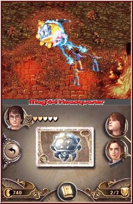 Der Einzelspieler Modus bietet nun neben dem Abenteuer 2 weitere Punkte. 2 der wenigen Unterschiede gegenüber der GBA Version. Zum einen versucht EA mit dem Punkt -Pflege für Magische Geschöpfe- auf den Nintendogs Zug aufzuspringen und zum zweiten sind die Minispiele hier anwählbar. Kann man sich der Pflege eines Nifflers, um die dreht es sich in diesem Modus sofort widmen, muß man die Minispiele erst freischalten. All dies geschieht auch hier über den Abenteuer Modus. Wählt man diesen an wartet sofort das erste von insgesamt 11 Leveln. Die gleichen wie auf dem GBA mit denselben Locations und Aufgaben. Auch hier spielt man diese nacheinander frei und das große Ziel ist neben dem Erreichen eines Endpunktes im Level das finden der Trimagischen Schilde. Hier findet man nun 99 im Spiel verteilt, was aber durch die Tatsache erklärt wird das auch der Nintendogs Ableger wie auch die Minispiele solche Schilde bieten. Alles beginnt mit einem direkten Kontakt mit dem Spiel und Ihr werdet in ein Tutorial Level geschickt, wo man euch Sichtweise, Vorgehen und Steuerung etwas näherbringt. Dabei geht Ihr als Spieler wie auf dem GCN und dem GBA zu dritt auf Pirsch. Allerdings bleibt das ganze in Sachen Hauptspiel bei einem Single Player Game. Ihr könnt zwar später vor jedem Level einen der 3 Helden als steuerbaren Charakter auswählen, die anderen beiden werden immer von der CPU übernommen und laufen mit euch mit. Ihr seht die Helden aus einer Iso Sicht von schräg oben und steuert die Gruppe so durch die einzelnen Wege. Dabei dient logischerweise das Kreuz für die Richtung und ist auch im 8-Way System umgesetzt. Geschicklichkeit wie in einem Jumper muß man auch hier nicht fürchten. Das Gameplay spielt sich im großen und ganzen mit A und der B-Taste ab.