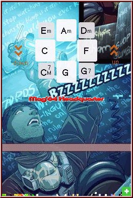 Seid Ihr soweit mit der Einführung erfolgreich und habt die Akkordpalette (acht Zellen, die mit unterschiedlichen Noten belegt sind) verinnerlicht, könnt Ihr die ersten Noten ohne weiteres ertönen lassen. Die Akkorde liegen auf dem Steuerkreuz. Abhängig welche der acht Richtungen (auch diagonal!) Ihr gedrückt haltet und gleichzeitig mit dem Touchpen über den berührungsempfindlichen Bildschirm streift, ertönt der von Euch gewünschte Akkord. In Verbindung mit der "L"-Taste habt Ihr die Möglichkeit acht weitere Akkorde zu spielen, so dass die Palette auf ganze 16 wächst. Ziemlich anspruchsvoll für einen unbedarften Gitarrenspieler. Gut, dass die ersten Songs in der umfangreichen Liste relativ einfach zu spielen sind und sich auf zwei Akkorde beschränken. Im Topscreen seht Ihr einen Abspielbereich, der durch Positions- und Anschlagshilfen gekennzeichnet ist. Weiterhin hilft ein Metronom, den richtigen Takt zu behalten und somit eine Orientierung im Song zu behalten. Ebenso macht es einen Unterschied ob Ihr die virtuelle Saite von oben (Abschlag) oder von unten (Aufschlag) anspielt.