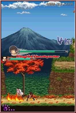 Insgesamt liegen vor dem Spieler nun 12 Level plus Bonus, inklusive ebenso vieler Boss Gegner. The Legend of Kage 2 ist spielerisch ein Arcade Action Titel wie er im Buche steht. Sobald ein Level beginnt, habt Ihr es mit einem 2D Titel zu tun, bei dem es das Ziel ist von Links beginnend nach Rechts einen Endpunkt zu erreichen. Dabei macht Ihr auf dem Weg keinerlei Gefangenen, oder müsst euch sonst irgendwie mit Denkaufgaben oder anderem Schnickschnack aufhalten. Hier heißt es nur die Waffen sprechen zu lassen. Und das möglichst erfolgreich. Die einzelnen Level sind in verschiedene Abschnitte unterteilt, voll von immer wieder neu generierten Gegnern und bieten nach dem Erreichen des Endpunktes immer einen Boss Kampf, der ganz speziellen Sorte. Die reinen Zutaten zum Gameplay sind zunächst recht simpel. Dabei unterscheiden sich die beiden Spielfiguren wie schon angesprochen in der Waffenart. 2 Grundtypen haben beide zur Verfügung. So hat Kage mittels der A-Taste die Möglichkeit mit dem Katana zu hantieren, während die Y-Taste die Wurfsterne abdeckt, die Ihr übrigens unendlich zur Verfügung habt. Die B-Taste deckt den Sprung ab, der ungewohnt weit nach Oben geht. Wobei man hier auch dem Feature Rechnung trägt, das die Spielumgebung über beide Screens gezeigt wird. Die X-Taste zu guter letzt deckt die Ninjutsu Möglichkeiten und damit Specials ab. An Anzeigen ist das Spiel ebenfalls sehr überschaubar gestaltet. Neben der eigenen Lebensleiste gibt es eine Score Einblendung und unterhalb im Touch Screen eine Doppelanzeige für die aktuell gewählt Ninjutsu Aktion und die sogenannte Kraft Anzeige. Spätestens bei allem was nur ansatzweise nach Bossgegner riecht nutzt man diese Möglichkeiten auch. Im Allerwelts Gameplay reichen auch die Standard Attacken vollkommen aus. Zu Beginn können beide nun einfach einmal Zuschlagen, weit nach Oben springen und sich an Wänden entlang nach Oben bewegen. Gegner warten an allen Ecken und Enden, was auch Baumkronen mit einbezieht, so das man hier sehr oft auch nach Oben schauen muss. Über die Steuerkreuz Richtung bewegt Ihr die Spielfigur und könnt euch sowohl Ducken, wie auch einen Sprint ansetzen, indem Ihr die Richtung doppelt drückt. Also in der Machart älterer Prügelspiele umgesetzt. Trefft Ihr auf Gegner, beginnt zudem bei Treffern ein Zähler die Kettenangriffe mitzuzählen. Sprich wenn Ihr es schafft Gegner mit nur kurzen Pausen zu erwischen, gibt es diesen Zähler. So ist z.b. eines der Ziele für die Kunstgalerie, 50 Treffer hintereinander anzubringen. Etwas das erst später funktioniert. Denn so langsam kommen die Feinheiten, die dem Spiel auch gut tun. Sonst wäre es einfach nur ein sinnfreies Tasten Hämmern im Spiel.