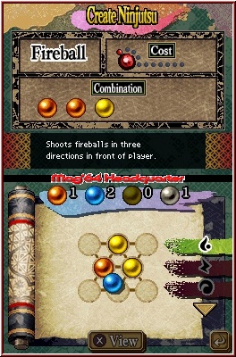 Erster Punkt ist später auf dem Kartenbildschirm der Abschnitt Fertigkeiten. Hier wird euch der momentane Status des Charakters angezeigt und Aktionen, die er oder sie im Verlauf des Spiels erlernen. Dabei kann man den Charakter teilweise auch entwickeln. Neben völlig neuen Aktionen, kann man so auch die Leisten erweitern und z.b. das Sprungvermögen verbessern. Aber man lernt eben zu bestimmten Zeiten auch völlig neue Moves. So können sie später mehrmals hintereinander zuschlagen, oder bekommen Specials für das normale Grundgameplay dazu. Spätestens wenn man am ersten Boss Gegner kläglich scheitern sollte, kommt auch das Thema Ninjutsu zu seinem Recht. Diese Magieattacken beherrschen beide und können im Spiel beliebig angepasst werden. Sofern man sie alle findet. Grundlage dafür sind zum einen sogenannte Elementkristalle und eine Papierrolle, die man auf dem Kartenbildschirm aufrufen kann. Darin finden sich 8 kleine Kreise, in die man die Elementkugeln platzieren kann. 4 verschiedene Arten dieser Elementkugeln gibt es, die man allesamt in den Leveln findet. Mal in Truhen versteckt, fallen einige auch vom Himmel, wenn man bestimmte Gegner in der richtigen Reihenfolge erledigt. Diese Kugeln sammelt man und setzt sie ganz nach eigenen Vorstellungen ein. Es gibt dafür keine Vorgaben. Hier muss man selber ein wenig herumprobieren. Findet man so eine Kombination, wird euch das Ergebnis visuell sofort angezeigt und man kann das ganze fest Speichern. Je nach Fertigkeit hat man nun die Möglichkeit mehr oder weniger lang diese Fähigkeiten im Spiel zu nutzen. Denn neben der reinen Wahl welche Ninjutsu man nutzen möchten, definiert die Kraftanzeige, wie lange sie anhalten. Diese können dann z.b. Eigenschaften des Charakters verbessern oder dessen Attacken. Beispiele dafür sind etwa, das man für die Dauer des Einsatzes seine Attacken verstärkt, oder man bei Treffern nur die Hälfte an Energie verliert. Beides allein schon Dinge, die speziell bei den Boss Kämpfen ganz immens helfen können. Denn die Boss Kämpfe sind oftmals schon das Salz in der Suppe. Kommt man durch die vielen Allerwelts Abschnitt mehr oder weniger schnell durch, hängt man hier zu gerne mal fest und sie definieren auch die schweren Abschnitte und hohen Schwierigkeitsgrad des Spiels. Hier sollte man also durchaus über ein dickes Frustfell verfügen. Positiv ist dabei aber die Tatsache, das man in der aktuellen Session immer wieder vor dem Boss einen Rücksetzpunkt nutzen kann. Schaltet man den DS aus und startet erneut, muss man das Level davor noch mal komplett angehen.