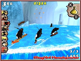 Pinguine haben es den Zuschauern und Spielern bekanntermaßen ziemlich angetan - nicht ohne Grund erobert ein Streifen nach dem anderen mit Pinguin-Inhalt die Popcorn-Säle dieser Welt. Wie der Name bereits verlauten lässt, hat man sich bei "Könige der Wellen" eingefunden, den Meister des Surfbretts zu ermitteln, den Königspinguin, dessen Talent, auf dem Wasser zu gleiten, das größte ist. Jedoch sind die Teilnehmer nicht zu einem x-beliebigen Wettbewerb angereist, sondern zu dem bedeutungsvollsten des Planeten, dem "Reggie Belafontes Big Z-Memorial Surf-Cup". Fünf Wettbewerbe gilt es hier zu bestreiten, der schnellste tierische Vertreter gewinnt das Spektakel und staubt nebst dem Pokal einen ganzen Haufen Ruhm und Ehre ab. Untergliedert ist das Abenteuer im Übrigen ähnlich wie die "Mario Kart"-Serie - jeder Wettbewerb besteht aus jeweils vier Rennen, wobei die ersten drei Euer Punktekonto dank guter Platzierungen füllen sollen, das vierte und abschließende Cup-Event hingegen als Ausscheidungsrennen dient.