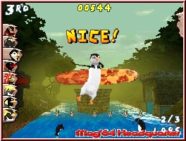 Vorbei geht es an weißen Sandstränden, mystischen Tempelanlagen und feurigen Lavakursen, jedoch immer auf einem Surfbrett und wenn nicht auf Wasser, dann rutscht Ihr auf klirrend kaltem Eis entlang. Links am Bildschirm erkennt Ihr Eure derzeitige Position im Rennen, Rangwechsel werden sofort dargestellt. Ebenso symbolisieren Pfeile die Euch verfolgende Meute, die in der Regel (Schwierigkeitsgrad: "normal") kaum eine Chance haben dürfte. Später hingegen aber schon… Im Grunde solltet Ihr darauf achten, eine möglichst gute Platzierung einzufahren, da Euch diese am meisten Punkte einbringt. Das Trick-Feature in "Könige der Wellen" wirkt hingegen aufgesetzt und hilft Euch hinsichtlich der Punkte nicht weiter. Erkennt Ihr eine Rampe, die durch blinkende Pfeile gekennzeichnet ist, solltet Ihr den Stylus bereithalten und - nachdem vier Tricksymbole auf dem Touchscreen eingeblendet wurden - so schnell als möglich auf diese tippen. Maximal vier Tricks könnt Ihr in der Luft in Folge ausführen, persönlich gelang uns dies im Spiel aber kein einziges Mal. Je nachdem wie viele Kunststückchen in der Luft zur Darbietung gebracht werden, belohnt Euch das System mit Punkten. Diese sind jedoch kaum der Rede wert, wenn man die Belohnung am Ende eines Rennens zum Vergleich heranzieht.