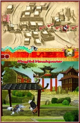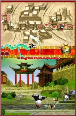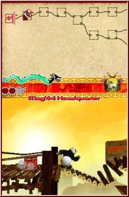 Bis auf die sich ständig wiederholenden Feindansammlungen, die teilweise erst besiegt werden müssen, so dass sich das nächste Tor öffnet, gibt es nur wenig zu sehen. Über den Topscreen erkennt Ihr den Aufbau des derzeitigen Levels in Kästchenformat, wobei diese alle miteinander in Verbindung stehen und später erneut bereist werden müssen, um weitere Orte zu entdecken. Die furiosen Fünf zu finden, ist Pos in weiter Ferne liegendes Ziel, das er sich aber fest vorgenommen hat. Um durch die teils mit mehreren Ausgängen bestückten Abschnitte zu kommen, wollen Bodenschalter über Hüpf-Einlagen betätigt, automatische Plattformen betreten und hochexplosive Fässer geworfen werden. Pos Panda-Rolle beschleunigt seine Fortbewegungsgeschwindigkeit und lässt ihn selbst weite Abgründe bewältigen, sein bebender Bauchklatscher zertrümmert robuste Holzplanken mit Leichtigkeit (durch eine Stylus-Bewegung nach unten wird jener ausgeführt!), auch das Entlanghangeln an in der Luft befindlichen Geiern ist eine Technik, die Po erst im Laufe des Abenteuers erlernt. Nur durch kombinatorischen Einsatz besagter Kung-Fu-Techniken kommt Ihr im Spiel voran, zerquetscht später Superkämpfer mit hochtechnologischer Rüstung per Touchpen-Tipp auf den Bildschirm und trefft irgendwann auf den letzten der furiosen Fünf. Vielleicht gelingt es Euch wirklich, der legendäre Kung-Fu-Kämpfer zu werden, von dessen Status Po schon so lange geträumt hat?
