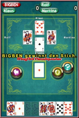 Bis auf „Solitär" lassen sich alle enthaltenen Kartenklassiker im Mehrspieler-Modus anwählen. Maximal vier Spieler können dann mit nur einer DS-Karte loslegen und sich in monotonen – da ohne Modi-Vielfalt – Partien beharken. Auf kurze Sicht machen die Kartenspiele auch durchaus Spaß, versprühen sie doch ein wenig Klassiker-Glanz in zeitlich unmodernem Gewand. Für die eine oder andere Session in Ordnung, ist es hingegen aber keine Pflicht ein Gruppenspiel von „Kult-Klassiker Kartenspiele - Best of Card Games DS" gesehen zu haben.