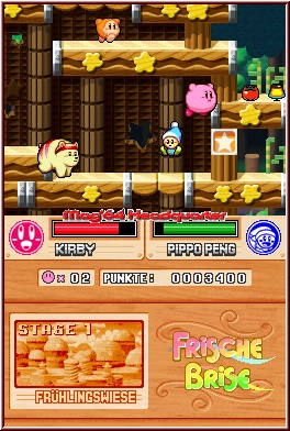Jetzt kommt die sicherlich größte Neuerung zum Einsatz. Mittels der X-Taste konnte man früher dies wieder ausspucken oder verlor es wenn euch Gegner treffen. In Super Star Ultra erzeugt Ihr damit einen CPU Mitstreiter, der euch begleitet und eben auch mit einem menschlichen Mitspieler genauso gespielt wird. Hier mit dem Unterschied, das er natürlich allein agiert. Im Falle des Flammengegners, der Ihr eben noch geschluckt habt, erweckt Ihr diesen per X-Taste zum Leben und er folgt euch wie an der Leine gezogen. Je nach Element agiert er selber und greift Gegner an oder zerstört Hindernisse. Im Touch Screen erscheint nun für ihn auch eine eigene Lebensleiste neben der Euren. Findet man später Power Ups um die Gesundheit zu regenerieren, so kann auch der CPU Mitstreiter so „geheilt" werden. Dieses Mitreiter Feature macht natürlich viele Abschnitte durchaus etwas leichter und gerade die zahlreichen Zwischen und Endgegner können ein Lied davon singen. ;-) Mit der Zeit lernt man die wieder reichlich enthaltenen Klassen und Elemente kennen, so das man sich regelrecht aussuchen kann, wen man an seiner Seite haben will. Und zur Not opfert man ihn halt, wenn man an einer Stelle etwas fest hängt. Einen neuen Gegner, den man zum Mitstreiter machen kann, findet man allemal. Allein dieses Feature wertet das Spiel auf und bringt den Spielspaß zusammen mit dem dazugehörigen Klasse Kirby Gameplay. In Jumper Manier durch die Etagen und Levelabschnitte um Gegner wegzubröseln. Völlig verschwunden ist damit also nun das Sammelfeature aus Mouse Attacke, bei dem man ja diese Fähigkeiten sammeln konnte. Das gibt’s hier nun nicht mehr. Dementsprechend hat man in vielen Situationen auch das Level Design etwas angepasst. Die Stellen wo man zu bestimmten Zeitpunkten auch eine bestimmte Fähigkeit haben musste, sind weitaus weniger geworden. Hier teilweise etwas anders gelöst.