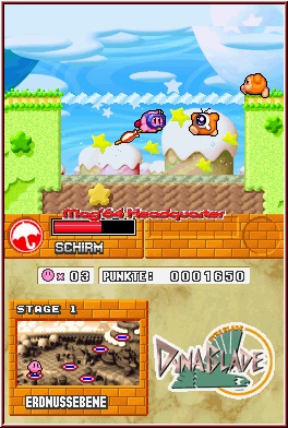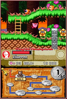 Alle Welten starten mit jeweils der Welt angepassten Sequenzen, die wie schon erwähnt eher mäßig gelungen sind. Danach landet Ihr auf einem Art Kartenscreen, der euch die einzelnen Level als Punkte anzeigt, welche per Linien miteinander verbunden sind. Sehr schön finde ich das Ihr in einigen Welten alternative Routen finden könnt und versteckte Level sichtbar macht. Da wie immer das Thema Türen in den Leveln selber eine Rolle spielt, erhöht man den Widerspieleffekt allein schon dadurch immens. Denn lässt man eine Tür in einem Level aus, so kann man sie logischerweise erst dann wieder nutzen, wenn man das Level noch mal spielt. Einmal gestartet folgt auch Super Star Ultra festen Gesetzen was die Screens angeht. Da man hier auf die klassische Steuervariante via Kreuz und Tasten setzt, spielt sich die eigentliche Action auf dem Top Screen ab, während der Touch Screen die Infos übernimmt. Neben der Levelkarte, dem erspielten Score, der eigenen Lebensanzeige, gibt es wieder die Energieanzeige für Kirby. Bei Treffern oder Fehltritten wird euch hier also etwas Energie abgezogen. Das 1-Treffer Feature ist hier glücklicherweise nicht vorhanden. Spielerisch warten zunächst die gleich Rahmenbedingungen, wie sie die Kirby Spiele schon immer boten. Die Action im Spiel spielt in 2D Umgebungen und steuert sich wie man es schon vor Jahren getan hat. Ihr bewegt Kirby wie in einem Jumper und lauft per Kreuz und könnt per A und Y springen. Einmal in der Luft könnt Ihr per Kreuz oben oder durch stetiges Antippen der Richtung Kirby durch die Luft fliegen lassen. Die B-Taste übernimmt einen weiteren wichtigen Teil im Gameplay. Hiermit könnt Ihr wie immer Dinge einsaugen. Einfache Gegner die man entweder herunterschlucken kann und als Geschoß auf weitere Gegner schießt. Aber das wäre ja nur die halbe Wahrheit in einem Kirby Spiel. Denn bestimmte Gegner bearbeiten euch mit Elementen oder Effekten. So speit ein Feuergegner Flammen in eure Richtung. Ihn kann man ebenfalls aufsaugen und drückt wieder Kreuz unten um ihn herunter zu schlucken. Mittels dieses speziellen Gegners kann Kirby erneut die Fähigkeit dieses Gegners annehmen und verwandelt sich nun zum Feuermonster. Was jetzt nichts anderes bedeutet das Kirby einen brennenden Kopf bekommt und Ihr per B-Taste Flammen auf alles loslassen könnt was sich bewegt oder ein Hindernis darstellt.