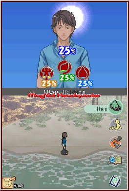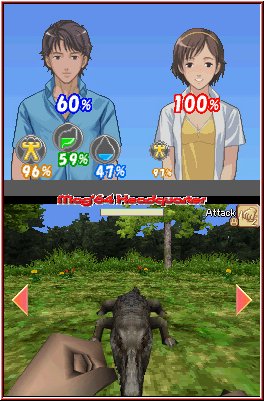 Positiv ist diesmal das Ihr beide Charaktere als Hauptfigur wählen könntet. Ihr habt also die Wahl als Amy oder Jack zu spielen, was auch verschiedene Endings mit sich bringt. Auch wenn die Aufgabe und Location natürlich die gleiche ist. Sobald Ihr euch für einen Charakter, in meinem Fall Jack, entschieden habt, startet das Spiel mit einer einführenden Sequenz aus gut gemachten Zeichnungen und einem durchaus imposanten Vorspann. Schade das die Spielgrafik daran nicht anschließt. Am Ende des Vorspanns seht Ihr im Touch Screen, der von nun an die Hauptaufgabe übernimmt und Spielaction darstellt, Jack wie er sich gerade am Strand erhebt und erstmal blöd in der Gegend herumschaut wo er wohl gerade ist. Dabei gibt es von nun an, wenn man so will 2 verschiedene Sichtweisen. Zum einen die Adventure Sicht mittels einer Iso Sicht schräg von oben und viele First Person Momente, in denen Ihr alle möglichen Aktionen erledigen könnt. In dieser Sicht erkundet Ihr von nun an die Gegend und lauft wahlweise per Kreuz oder Pen Action auf dem Touch Screen umher. Kurze Zeit später trifft Jack auf Amy und das Spielchen auf der Insel zu Überleben beginnt. Wie schon im ersten Teil definiert sich das Spielziel auf seine eigene Weise. Denn um zu Überleben müssen einige elementare Anzeigen im Top Screen immer im Auge behalten werden. Per R-Taste schaltet Ihr zum einen zwischen einer Luftaufnahme der Insel, einer Kartenfunktion und den persönlichen Stats der beiden hin und her. Man merkt schnell das man die persönlichen Anzeigen am meisten in den Vordergrund rückt.