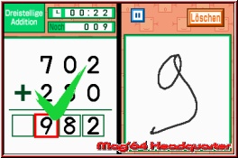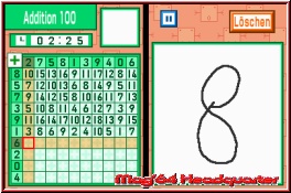 Wie schon bei den Dr. Kawashima-Titeln wird auch das Mathematik-Pendant ähnlich eines Buches in der Hand gehalten, die Navigation erfolgt per Touchpen. Somit ist die Schrifterkennung das wichtigste Hilfsmittel, um die gestellten Aufgaben erfolgreich lösen zu können. Wie sooft gibt es speziell bei der Erkennung der Zahl "2" und der Ziffer "8" Probleme. In hektischen Situationen ist diese Tatsache nervtötend und unverständlich, warum es bislang nicht gelingen konnte hier für Abhilfe zu sorgen. Bevor wir uns dem "Täglicher Test" zuwenden, werfen wir zunächst einen Blick auf die "Übungen", die in den verschiedensten, variantenreichen Ausführungen auf die Karte gebannt wurden. In acht Kategorien, die vom Schwierigkeitsgrad her mit der Zahl stetig ansteigen, preist Ihr Eure Fähigkeiten an - Erklärungen der einzelnen Aufgabenbereiche bringen Klarheit in das Dickicht von Mathematik-Übungen. Lückenmultiplikationen lassen sich beispielsweise dadurch lösen, indem das frei Feld (3 mal x = 24; Lösung: 8) mit der korrekten Zahl gefüllt wird. Richtzeitwerte geben Euch Aufschluss darüber, wie schnell Ihr agieren und rechnen müsst, um in die Nähe von Medaillenrängen zu gelangen. Einfachste Additionen erwarten Euch ebenso wie Kombinationen von Grundrechenarten. Blitzsubtraktionen blenden kurzzeitig die zwei voneinander zu subtrahierenden Zahlen ein - diese müsst Ihr sodann voneinander abziehen. Multiplikationen mit allen einstelligen Zahlen wurden ebenso integriert, wie Kettensubtraktionen, die man in ähnlicher Weise bereits in der Grundschule niedergeschrieben hat. Dreistellige Subtraktionen, lange Multiplikationen, Fülladditionen sowie das Durcheinanderwürfeln aller Grundrechenarten sind Hauptthematik innerhalb der "Übungen". Wer mit Zahlen nicht vertraut ist und diese scheut, freundet sich mit der Software wohl auch in Zukunft nicht an. Objektiv betrachtet, bleibt der Titel aber zu jeder Zeit fair und summa summarum bezüglich des Anspruchs eher bescheiden. Vertrackte Aufgaben gibt es so gut wie keine, auch werden Euch keine absonderlichen Thematiken vorgesetzt.