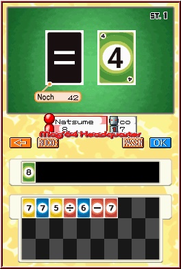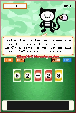 „Prof. Kageyamas Mathematik-Training - Verbessern Sie Ihre Rechenfähigkeit mit der Hundert-Zellen-Methode" war zwar ein Titel, den man der Spielerschaft uneingeschränkt hätte empfehlen können, dafür waren die Inhalte umfangreicher als es bei „Maths Play" der Fall ist. „Zahl-Waage", „Zahl-Meister", „Zahl-Egal" und „Zahl-Reich" stellen nicht gerade umwerfende, allumfassende Monsterbereiche mit unendlich Spielspaßpotenzial dar, demnach sollte man sich für einen eventuellen Nachfolger auch einige zusätzliche Elemente einfallen lassen. Was uns positiv überraschte, ist die Tatsache, dass zu jedem Bereich ein eigenes Regelwerk vorliegt, welches Euch Allgemeines sowie Spezielles erklärt und anhand von Screenshots verdeutlicht. Soweit sind wir also zufriedengestellt, daher wollen wir mal schauen, wie sich der Aufbau der einzelnen Modi zusammensetzt. Der Blick fällt zunächst auf die „Zahl-Waage": Maximal fünf Schwierigkeitsstufen können im Laufe der Zeit freigeschaltet werden, ein „Stufentest" bildet die Spitze der mathematischen Pyramide. Insgesamt gilt es zehn Stufen zu erklimmen, die allerdings erst dann Realität werden, wenn Ihr mit der Software eingespielt seid und langwierige Überlegungen nicht mehr notwendig erscheinen. Denn Tipps seitens des Spieles gibt es später nämlich nicht mehr. Außerdem lässt sich der „Stufentest" nur einmal pro Tag anwählen – somit soll eine stetige Verbesserung Eurerseits kenntlich gemacht werden. Das Spielziel der „Zahl-Waage" ist es, korrekte Gleichungen durch das Verschieben von Zahlenkarten zu bilden. Durch das Ordnen der zur Verfügung stehenden Karten – abhängig nach der gewählten Schwierigkeitsgradstufe – in das Gesamtgefüge und das Einbauen der Rechensymbole soll die Gleichung gelingen. Allerdings bedarf es noch der Auswahl des „="-Zeichens. Jede einzelne Karte symbolisiert dies in der Theorie, dennoch geht die Rechnung nur dann auf, wenn Ihr die richtige Karte als „="-Symbol ausgewählt habt. Ein „Tipp"-Button hilft Euch auf die Sprünge indem er sagt, welche Karten zuerst verwendet werden sollen.
