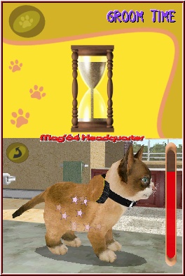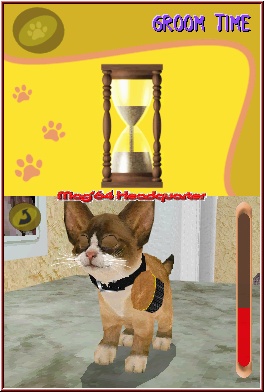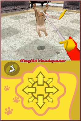 Dass Ihr immer alles im rechten Blick habt, dürft Ihr die Kamera mit dem Steuerkreuz 360° in horizontaler Ebene um Euer Tier herumbewegen, ebenso ist der Zoom möglich. Die Steuerung funktioniert sehr flüssig und gestaltet sich intuitiv, selbst kleinere Minispiel-Einlagen wurden in das Spiel hinein gearbeitet: So rubbelt Ihr mit dem Stylus über die Losung im Katzenklo, um dieses wieder sauber zu machen, andererseits wirkt Ihr juckendem Flohbefall entgegen, indem Ihr Eure Katze regelmäßig und reichlich bürstet. Was allerdings nie zu kurz kommen sollte, ist sie Interaktion mit Eurem Schützling (auch Sprachbefehle sind möglich!), das Spiel, sei es beim Herumtollen in den unterschiedlichen Hausbereichen, oder anhand von witzigen Gegenständen, die Ihr im Laden erwerben könnt. So wählt Ihr unter anderem zwischen einer Spielzeugmaus, einem Kipplaster, einer Angel, einer Spielkordel, sowie einem Springball. Diese bewegt Ihr nun vor der Nase Eurer Katze herum, so dass diese in Spiellaune gerät. Beispielsweise lasst Ihr den Schmetterling fliegen, indem Ihr kräftig in das Mikrofon des Nintendo DS pustet, im Laster fahrt Ihr Euren Vierbeiner herum, hupt und kippt die Katze auf Wunsch auf den Boden.