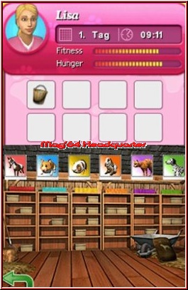 Während Ihr so durch das Tierheim streunt, wird Euch erst bewusst, wie verantwortungsvoll Eure Arbeit hier eigentlich ist – für Zufriedenheit zu sorgen, ausreichend Wasser und Futter bereitzustellen, ebenfalls Abfälle zu beseitigen oder die Besucher der Pflegestätte zu empfangen, sind alles Aufgaben, die man als Praktikantin zu erledigen hat. Von schräg oben wird das Geschehen im weitläufigen Hof präsentiert, braucht das Alter Ego mal eine Verschnaufpause, spannt Ihr Euch im Ruheraum aus und wartet, bis die Energieleiste auf optimalem Niveau ankommt. Was man dem Titel anmerkt, sind die fehlenden Touchscreen-Unterhaltungen, denn anders als in speziell entwickelten Software-Umsetzungen für den DS, ist das Gameplay begrenzt auf Steuerkreuz- und Knopfdrück-Einlagen. Es reicht also aus, via Druck auf den Screen dem Tier Wasser zu geben oder Futter in den Napf zu geben. Dies enttäuscht, da wir es schon vielfach innovativer umgesetzt gesehen haben. Da nützen selbst die zahlreichen Gesten- und Sprachbefehle nicht viel, die Ihr während Eurer Versuche, Hunde und Katzen besser kennen zu lernen, austesten dürft. Lieber wäre es uns gewesen, selbst direkt eingreifen zu können, ein wenig Fellpflege hier, ein bisschen Touchscreen-Spielereien dort oder wie wäre es mit einigen Trainingseinheiten, um Eure Tiere perfekt auf ihre zukünftigen Besitzer vorzubereiten? Andererseits: Der speziell für sehr junge Spielerinnen entwickelte Titel führt Euch an der Hand, der Professor erklärt Euch jede Einzelheit, führt Euch zunächst in das Spiel ein und hilft somit jegliches Detailwissen zu verinnerlichen. Gut gefallen hat uns weiterhin das ausführliche Tierlexikon mit allerlei Wissenswertem, seien es Informationen zu den einzelnen Tierarten oder aber Umgangs- und Fütterungshinweise. Für jede Eventualität seid Ihr also bestens gewappnet!