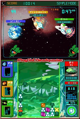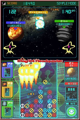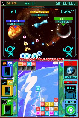 Der Multiplayer ist eingeteilt in eine Single und Multi Cartridge Variante. Bei beiden gleich ist das maximal 4 Spieler gegeneinander antreten. Jeder mit seinem Spielfeld und der Sicht auf seine Kontrahenten oben und links in den Anzeigen. Vorteil der Multi Card Variante das jeder seinen Heimatplaneten und damit auch bevorzugtes Grafikset mitbringt, während in der Single Variante der Planet vom Spielbesitzer gewählt wird. Ebenso werden nur in der Multi Variante erspielte Scores auch gespeichert. So spielt man also nicht umsonst. Man kann Handicaps einstellen und auch Teams wählen. Wie im Single Player auch könnt Ihr einen Gegner speziell unter Feuer nehmen, in dem man das Symbol links antippt. Vor allem bei gleichstarken Spielern ist der Multiplayer eine sehr gelungene Sache.
