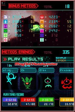 Hat man nun ein wenig Spielzeit hinter sich begibt man sich in die Rubrik Fusion auf dem Hauptmenu und bekommt bei entsprechender Menge neue Planeten die man freischalten kann. Ebenso Items, die man im Spiel nutzen kann und so z.b. Teile des Screens leeren oder wilde Meteos zünden können. Da man anfangs nur sehr wenige Planeten zur Verfügung hat eine feine Sache. Im gesamten ist Meteos ein abgedrehtes Spiel, das schon lange Spaß machen kann. Was mich persönlich stört sind manche Meteos Designs, die zwar jeden Kreativpreis gewinnen können, aber auf Dauer in dem sehr hektischen Spielprinzip auch kontraproduktiv sein können. Wenn dazu der Speed noch extremst wird sorgt allein das schonmal für ein Game Over.