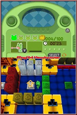 Das Grundlayout der Steuerung ist gleich und einfach Frogger typisch auch in Toy Trials. Ihr könnt den kleinen Racker nämlich nur in 4 Richtungen bewegen. Per Steuerkreuz um 1 imaginäres Feld nach allen Seiten, mit der B-Taste um 2 Felder per Sprung und könnt ihn per L und R dabei auf der Stelle drehen. Denn steht Ihr z.b. auf einer einzelnen Plattform und schaut nach oben ist ein Drücken auf dem Kreuz nach links gleich mit einem Schritt nach links verbunden. Ist dort kein Feld stürzt Ihr ab. Die Steuerung selber ist sehr gelungen und bietet keinen Anlaß zur Kritik, wenn man sich einmal daran gewöhnt hat. Man muß trotzdem zunächst umdenken, wenn man Frogger durch die Gegend schickt. Ziel ist es in jedem Frogger Level einen Endpunkt zu erreichen. Wobei viele Level alternative Wege bieten, die in einer versteckten Area oder einem Minispiel enden. Bis dahin warten reichlich Gefahren und Hindernisse auf euch. Gestaltet sind die Level auf verschiedenste Arten und ähnlich umfangreich wie bei den Vorgängern. Neben Leveln mit reichlich Platz zum Laufen gilt es auch hier wieder genau abgesteckte Wege abzulaufen, die immer den Wechsel aller Steuervarianten nach sich ziehen. Sehr oft muß der Spieler um die Ecke denken und der offensichtliche Weg ist nicht immer der richtige. Dazu kommen weitere Aktionen die das ganze spielerisch hier und da aufwerten. Die X-Taste dient dazu auf der Stelle nach oben zu springen ohne sich ein Feld weiter zu bewegen. Zum einen erreicht man so höher hängende Münzen und darf sich in Zusammenhang mit der Y-Taste auf einen weiteren Move freuen. Denn per Y aktiviert man Frogger's Zungenmove, der schon im Vorgänger enthalten war. Damit kann man auf der Stelle stehend 3 Felder weit die Zunge ausfahren und z.b. Items für die Lebensleiste zu sich ziehen.