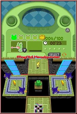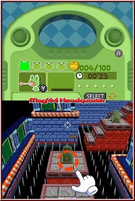 Kümmern wir uns zuerst mal um dieses Grund Gameplay mit Frogger. Über einen Transportroboter könnt Ihr euch innerhalb der Welt auf kleine Inseln bringen lassen. Hier warten die 5 Herausforderungen oder eben Minispiele. Anfangs noch nicht alles über einen Kartenscreen anwählbar, ist ein Vorteil das Ihr im Verlauf des Spiels jederzeit alles und jeden nochmal angehen könnt. Ebenfalls jederzeit Speichern könnt Ihr im Adventure Gameplay. Das Spiel enthält unter anderem ein Upgrade System über Kostüme, die Frogger mit speziellen Fähigkeiten ausstatten. Da man diese mit der Zeit erst komplettiert, sind manche Wege in den ersten Frogger Leveln noch nicht möglich. Logisch das dahinter spezielle Boni warten, die man so später noch holen kann. Erreicht Ihr ein Frogger Level und damit eine der 5 Pflichtaufgaben werdet Ihr kurz eingewiesen und der Screen schwenkt auf die typische Frogger Sicht um. Dabei spielt sich das ganze erneut auf dem Touch Screen, während der Top Screen informatorische Aufgaben übernimmt. Positiv das Konami die Lebensleiste beibehalten hat. Oberhalb zu sehen sind diese Energiebehälter in Form kleiner Froschköpfe umgesetzt. Jeder davon besteht aus 4 Zellen, sprich Trefferpunkten. Stürzt Ihr also mal in's Wasser oder ein Gegner trifft oder berührt euch zieht man euch eine Zelle ab. Das man diese nun auch noch erweitern kann sorgt an vielen Stellen für eine wesentlich geringere Frustgefahr als früher. Zudem sind die Level von Rücksetzpunkten durchzogen. Etwas zahlreicher enthalten als in Helmet Chaos sorgen diese beiden Feature für ein flüssigeres Gameplay, wo man sich eben doch mal einen oder mehrere Fehler erlauben kann. Und die passieren unweigerlich. ;-) Denn der Schwierigkeitsgrad der Frogger Level ist durchaus auch hier nicht von Pappe. Schon ab Welt 2 kann der Spieler ein Lied davon singen.