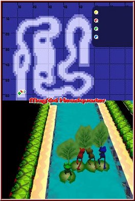 Der Multiplayer bietet euch 3 Minispiele, die man mit bis zu 4 Leuten spielen kann. Neben einer Multi Card Variante, die natürlich viel schneller zur Verbindung führt, steht auch eine Single Card Variante zur Verfügung. Inhaltlich gleich wartet man hier natürlich teils extrem lange ehe das Spielchen beginnt. Neben dem Lungenintensiven Racer stehen euch eine Art Tennis Variante zur Verfügung, bei der über beide Bildschirme 2 Teams antreten können. 3 Punkte, sprich Tore muß man erzielen und kann wie bei einem Tennisplatz einen Spieler an der Grundlinie und einen an der Mitte platzieren. Nett aber sehr kurz. Das beste Spielchen ist sicher das Endkampf Minispiel. Hier gilt es sich lautlos an einen Gegner heran zu schleichen. Gegenseitig kann man sich hier nur sehen wenn sich die Gegner bewegen. Dann sieht man kleine Laufeffekte. Das Ziel ist es via Y Taste eine Bodenwelle auszulösen. Schleicht man sich hinter einen Gegner, den man vielleicht gesehen hat löst man diese Aktion aus, beide werden kurz sichtbar und man bekommt einen Punkt.