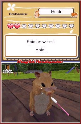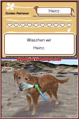 Denn grafisch muß sich das Spiel keinesfalls vor der Nintendo Konkurrenz verstecken und bietet ähnliche Animationen und Proportionen. Sobald Ihr eine erste kurze Bekanntschaft gemacht hat, startet die Operation Zähmung. Nach wie vor wird der Hund im Top Screen angezeigt, während nun im Touch Screen verschiedene Anzeigen und Menupunkte auf euch warten. Diese Menupunkte kann man scrollen, da es mehr sind als gleichzeitig auf den Screen passen würden. Dazu die ganz wichtige Herzenanzeige. Das Ziel muß es nun sein den Hund zu zähmen. Das geht nur wenn Ihr die Zuneigung des Tieres erhaltet. Über diese Herzenanzeige wird euch immer angezeigt wie sehr das Tier euch mag. Um nun die Herzleiste zu füllen gilt es die Menupunkte im Touch Screen zu nutzen. Das beginnt beim Füttern des Hundes, reicht über das Streicheln, Bürsten und Waschen bis hin zu den Punkten Spielen und Ausgehen. Tippt man einen dieser Punkte an, wechselt die eigentliche Action nun logischerweise in den Touch Screen. Beispiel Streicheln und das ganze spielt sich haargenau wie Nintendogs. Per Pen, der sich erneut am besten macht, führt Ihr eine Hand über das Fell des Hundes, der euch nun durch kleine Glitzersternchen anzeigt das ihm das gefällt, was Ihr gerade tut. Im Gegenzug gibt er aber auch mürrische Töne von sich, wenn Ihr ihn irgendwo streichelt, wo er es garnicht mag. Irgendwann habt Ihr genug gestreichelt und der Bildschirm wechselt von selber zurück auf die Ausgangsvariante. Ihr erhaltet in einer kleinen Animation ein "Feedback" vom Hund, der euch nun je nach Gefühl 1 oder 2 Herzen spendiert. 4 Herzen sind im Spiel nun das Minimum das Ihr Erreichen solltet. Denn ab 4 Herzen gibt es die ersten Fotos in euer Album. Um die Herzanzeige nun zu pushen nutzt man alle Möglichkeiten des Menus. Mal Füttern oder Ausgehen um dann wieder zu streicheln oder das Thema Sauberkeit ins Spiel zu bringen. Hier kommt nun langsam der entscheidende Nachteil gegenüber der Nintendogs Reihe zum Tragen. Es gibt im Spiel weder einen Shop, noch Wettbewerbe oder großartige Auswahlmöglichkeiten bei den Items. Allein das Füttern ist immer gleich und besteht nur aus der Reihenfolge von 3 möglichen Futter Utensilien.