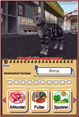 Das heißt das Ihr bei den Tieren immer das gleiche tun könnt, ohne das sich später Secrets zeigen, die sich direkt auf die Tiere auswirken. Ebenso fehlt hier ein Zeitfeature, was eher dem Gelegenheitsspiele entgegen kommt. Das heißt Ihr könnt den DS auch mal ein paar Tage links liegen lassen, ohne das euch die Tiere davonlaufen. Die Stärke des Spiels liegt eigentlich in anderen Dingen. So z.b. eben bei der Vielfalt der Tierarten. Sobald Ihr ein Tier auf 2 Herzen Zuneigung gebracht habt, beginnt es nach einem Freund zu rufen. Was hier nichts anderes bedeutet das auf der Umgebungskarte an den 7 Locations plötzlich nach und nach neue Tiersymbole auftauchen. Dabei ist das ganze nun eben nicht nur auf Hunde beschränkt und Ihr erlebt die Tierpflege auf verschiedene Weise. Neben zahlreichen Hunde- und