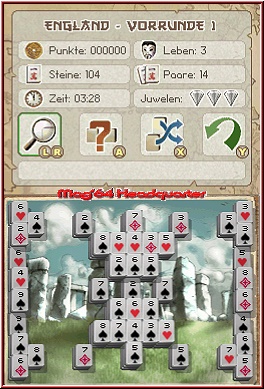 Wie es sich für den Nintendo DS gehört, wird das Zusammenbringen von Paaren mit dem Stylus erledigt, was größtenteils gut funktioniert, ab und an aber an kleinen Stellen hakt. Habt Ihr zwei übereinstimmende Motive gefunden, verschwinden diese vom Bildschirm. Zusätzliche Funktionen wie das Mischen der Spielsteine, der direkte Zoom auf das Spielbrett oder die Anzeige aller noch möglichen Paare erleichtern Euch das Vorankommen, speziell bei Meistern, die als Endgegner fungieren und das Spielchen ziemlich gut drauf haben. Kurz hintereinander aufgelöste Pärchen erzielen Combos, was Punkte auf dem eigenen Konto gutschreibt. Interessant ist die Anzeige, welche die aktuellen Pärchen-Möglichkeiten auflistet sprich die bloße Zahl der Gelegenheiten registriert. Wie es sich für ein dem Geschmack der Zeit angepasstes Stück Software gehört, warten auch besondere Goodies auf ihre Entdeckung, die Ihr auf Wunsch einsetzen könnt, wodurch euch ein teils außerordentlicher Vorteil verschafft wird. So ist es unter anderen möglich mit Dynamitstangen einen Stein und dessen Nachbarn zu zerbröseln oder per Wirbelsturm eine stattliche Zahl dergleichen zu zerstören. Mithilfe des Magischen Auges unterwandert Ihr aufeinanderliegende Steine, mit der Magischen Hand lassen sich die Spielobjekte nach Lust und Laune versetzen, was zu taktischen Vorteilen führen kann. Die Sanduhr schenkt Euch hingegen einen Zeitbonus von ein paar Sekunden, allerdings habt Ihr diese auch bitter nötig, speziell dann, wenn Ihr die interne Hilfefunktion ausgekostet oder das Spielbrett durchgemischt habt – das kostet Zeit, die Euch eventuell am Ende abgehen würde. Bei einem Goldenen Paar wird das aktuelle Spiel sofort für gewonnen erklärt, gefundene Juwelen werden im Finalkampf in Boni umgewandelt, die im Folgenden als durchschlagendes Extramittel verwendet werden können.