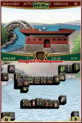 Die Spielregeln von „Mahjongg DS" sind leicht verständlich. Verschiedene Spielsteine auf einem Brett müssen paarweise abgeräumt werden, allerdings ist das nur dann möglich, wenn die nach Figuren aufgebauten Steinformen so liegen, dass einzelne Steine nicht überlagert sind oder beiderseitig verbaut wurden. Erst wenn das Brett komplett geleert wurde, ist das Etappenziel erreicht. Selbstverständlich gibt es für einzelne Steinpaare auch Punkte, sei es durch besonders schnelles Spiel oder durch eine vorgegebene Bepunktung einzelner Paare. Auch wenn die vier Spielvarianten nicht unbedingt der Vielfalt wegen ins Auge stechen, machen sie einen generell ansprechenden Eindruck, da das Spiel sowie die Hintergrundgeschichte gewissermaßen Hand in Hand gehen. Bei der klassischen Umsetzung, dem „Baumeister", errichtet Ihr pro gefundene Steinchenübereinstimmung einen Teil des eigenen Schlosses. Ein zweiter Modus erlaubt den Bau eines Schutzwalles, selbstverständlich durch ein Zeitlimit begrenzt, was schlussfolgern lässt, dass Ihr möglichst zackig die sich gleichenden Steine finden müsst, um Wall und Erfolg zu sichern. „Sung Tsu", gleich lautend mit der „Hauptfigur" des Spieles, ist eine Spielvariante, bei welcher Ihr durch geschickten Steinabbau Pfade freischaufelt, um Eurem Helden einen Weg zum Ziel zu bahnen. Last but not least der „Eroberer": Dieser hat mit dem klassischen Mahjong kaum etwas gemein, sondern hierbei handelt es sich um eine Umsetzung, die durch das Bilden von Reihen überzeugen kann. Mindestens drei übereinstimmende Symbole müssen in komfortabler Bedienungsweise gefunden werden, jedoch mit dem Hintergrundwissen, dass der gesamte rückwärtige Bildschirm durch das Puzzeln eingefärbt werden muss. Taktisch eine große Herausforderung für jeden Rätselveteranen!