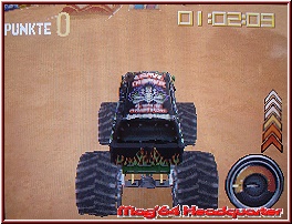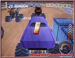 Was schon hier schnell negativ auffällt ist der View Point im Spiel. Erstens gibt es nur einen und zum zweiten ist dieser recht nah am Fahrzeug, was durchaus mal für Übersichtsprobleme sorgen kann. Speziell in den Renn Modi später. Gesteuert wird Rennspiel Typisch über das Steuerkreuz, samt A und B für Gas und Bremse. Gut gemacht ist das separate Nutzen beider Achsen, so dass man auch beide völlig verschieden oder gleich nutzen kann. Das sorgt z.B. dafür, das Donuts überhaupt kein Problem sind, weil man eben Vorder- und Hinterachse nutzen kann. Auch später in den Rennevents kann man so viel direkter Einlenken, wobei dort andere Dinge für Ärger sorgen. Im Stunt Modus habt ihr Platz und könnt so easy im Stadion agieren. Per X-Taste könnt ihr einen Nitro zuschalten, der euch vor einer Schanze natürlich mehr Speed verleiht und höhere und weitere Sprünge zulässt. Hier Punktet auch die Engine und die Physik. Zwar kann ich wenig über einen real zu steuernden Monster Truck als Vergleich heranziehen, aber verkantetes Landen und einknickende Trucks erlebt man sehr oft. Mal landet man je nach Tempo und Winkel in der Luft, den man beeinflussen kann, auf den Vorderreifen oder kann eben im richtigen Moment einen Wheelie hinlegen. Das ist schon ganz passend gemacht und geht eigentlich leicht von der Hand. Etwas anders sieht es bei den reinen Rennen aus. Zwar führt euch hier der Weg auch mal nach Draußen und 2 Runden sind hier meist zu absolvieren. Kranken tut hier aber der Renn Modus an den zu engen Strecken, dem angesprochenen Übersichtsproblem und der etwas hakeligen Steuerung. Ist so oft mehr ein Krampf. Dabei fährt man immer gegen 3 CPU Dödel, die euch aber in der Regel nicht das Wasser reichen können.