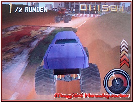 Grafisch ist Monster Jam auf dem DS so eine Sache. Man hat zwar schon versucht, die Trucks selber in den Vordergrund zu rücken, erkauft sich dies aber gerne mal durch recht grobe und einfache Umgebungsgrafiken. Wirkt alles recht steril und nur selten sorgen Effekte abseits der Trucks für eine gewisse Lebendigkeit. Die Trucks selber sind gut gestaltet und kommen auch von den Proportionen her recht gut rüber. Der Game Speed selber stimmt und auch die Kollisionsabfrage gibt wenig Anlass zur Kritik. Oft ist sie eher noch zu genau, was gerade in den Rennen für manch unglückliche Landung oder einen nicht gewollten Ausflug in die Pampa sorgt. Zumindest dort wo die Strecken mal nicht so eng sind. Hier wäre durchaus mehr möglich und vor allem ein etwas weiter entfernter Kamera Punkt hätte dem Spiel gut getan.