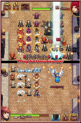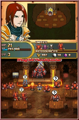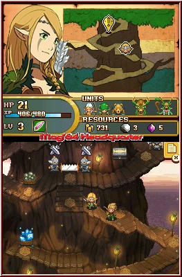 Beginnt das Spiel im Adventure Modus und Ihr dürft erstmals selber den Helden bewegen, habt Ihr an Stats und Ressourcen erstmal gar nichts. Ihr besitzt Level 1, keine Einheiten, geschweige denn Geld und Ressourcen. Eher überraschend gesellen sich dann die ersten Einheiten zu euch, in diesem Falle die Schwertkämpfer. Und schnell zeigt sich ein weiteres Feature. In den späteren Kämpfen spielt nicht der Held selber die Hauptrolle, sondern die Einheiten die Ihr mit in den Kampf nehmt. Das er dennoch ein Level besitzt, liegt an der damit verbundenen HP Anzeige, die in den Kämpfen immer das Ziel ist um zu Gewinnen. Im Verlauf einer Handlung könnt Ihr 3 verschiedene Einheiten Varianten rekrutieren, von denen Ihr dann immer einige Auswählen müsst, die im Kampf agieren sollen. Da gibt es im Falle von Godric als erstes die Basiseinheiten mit den Schwertkämpfern, den Speerträgern und den Bogenschützen. Dazu könnt Ihr nun als zweites die Eliteeinheiten mit den Rittern und den Priestern wählen, oder entscheidet euch als letztes bei den Meistereinheiten für den Engel, den Greif oder den Schwertmeister. Und auch hier gibt es weitere feste Regeln. Aus diesen 8 verschiedenen Einheiten könnt Ihr nur maximal 5 verschiedene auswählen. Dazu gibt es Slots im Einheiten Bildschirm, wo man 3 Slots für Basiseinheiten zur Verfügung hat und nur derer 2 für Elite- und Meistereinheiten. Der große Unterschied im Gameplay ist natürlich neben der Wirkung der Einheiten im hier enthaltenen Rundenbasierten Kampfgameplay die Zeit bis zur Aktivierung. Auch das Level selber ist begrenzt. Könnt Ihr den Helden maximal auf Level 10 entwickeln, reicht das ganze bei allen Einheiten nur bis zu Level 5. Jeder Kampf bringt Erfahrungspunkte und Ressourcen, so das hier das gewohnte System greift. Einheiten die man nicht im Kampf dabei hatte, bekommen hier allerdings keine EP. Zusätzlich gibt es noch Unterschiede in Sachen Kosten und Anzahl. Stehen euch die Basiseinheiten unendlich zur Verfügung und kosten nichts, sieht das bei den Elite- und Meistereinheiten anderes aus. Maximal 10 Elite und 5 Meistereinheiten dürft Ihr besitzen, die im Kampf auch verloren werden können.
