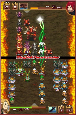 Zunächst mal entscheidet das Level der Einheit darüber wie stark der Angriff werden kann. Erreichen Schwertkämpfer auf Level 1 maximal einen Wert von 5 AP, die man der gegnerischen HP Leiste abzieht, so reicht das bei Level 5 Cracks bis zu 11 AP. Stünde ihnen nichts im Wege und erreichen sie die HP Leiste des gegnerischen Helden, so würde man diesem auch diese 11 HP abziehen. Aber das ist eher der unwahrscheinliche Fall. Denn meist kommen viele Zahlenspiele dazu. Stehen auf der anderen Seite z.b. ebenfalls aufgeladene Basiseinheiten mit der gleichen Stärke, so würden beide vom Spielfeld verschwinden. Ist im Moment des Angriffs euer Angriffswert z.b. um einen Punkt höher, vernichtet Ihr die Einheiten auf der anderen Seite und zieht der großen HP Leiste eben nur noch diesen einen Punkt ab. Weiterhin besitzen die Gegner auch die Möglichkeit der Wälle, die man auch noch in mehreren Stufen upgraden kann. Hat dieser Wall z.b. die Stärke 14 und euer Angriff 11, so wird eure Einheit vernichtet und ein Wall mit der Stärke 3 bleibt noch stehen. Soweit das Grundprinzip des Kampfes, das aber derart viele Facetten bietet, bei dem allein der Umfang alles zu Beschreiben, jeden Leser beim Lesen wohl einschlafen lassen würde. ;-)) Und das will ich ja nun auch nicht. Aber ein paar Sachen will ich natürlich schon noch bringen. Die Basiseinheiten sind nämlich auch dazu da, die Elite- und Meistereinheiten ins Spiel zu bringen. Auch wenn diese um einiges mächtigere Attacken bieten, sind sie allein zu nichts zu gebrauchen und könnten auch vom Gegner locker vernichtet werden. Nehmen wir mal die Ritter bei Godric, die voll gelevelt eine Stärke von 30 Angriffspunkten haben. Um diese aufzuladen, also in den "Timer Modus" zu bringen, müssen wieder 2 gleichfarbige Basiseinheiten dahinter gestellt werden. Hier dauert es nun 5 Runden, ehe die Attacke steigt. Im Gegenzug sind sie aber auch als Verteidigung sehr gut. Denn die 30AP wirken ja auch bei einem gegnerischen Angriff. Greift euch der Gegner auf dieser Linie mit einer 20AP Einheit an, so bleibt euer Ritter stehen, hat aber jetzt nur noch 10AP für den eigenen Angriff. Bei den Meistereinheiten müssen gar 4 Basiseinheiten gleicher Farbe dahinter gestellt werden. Und bei 3 Zügen pro Runde geht das nicht in einer Runde. Und wieder…., theoretisch. ;-) Denn wie in einem Puzzle Spiel gibt es Boni an allen Ecken und Enden. Verbindet Ihr z.b. 3 Einheiten zu einer Angriffs oder Verteidigungsformation, rutschen wie schon erwähnt alle anderen Einheiten jeweils nach. Schafft man es durch diese Aktion 3 weitere Truppenteile irgendwo auf dem Spielfeld zu verbinden, gibt es einen Bonuszug. Stichwort Kettenbildung wie halt in vielen Puzzle Spielen. Das hat schon was und bedingt durch den fehlenden Zeitdruck, fängt man irgendwann an ganz genau zu schauen wie welche Position am besten wirken könnte.
