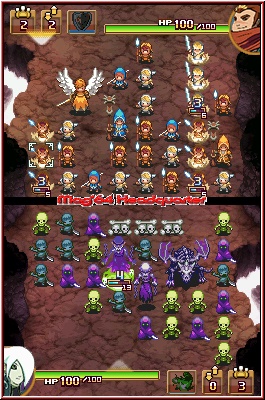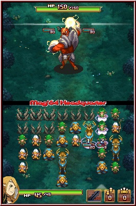 Zudem kann dem Helden ein sogenanntes Artefakt angelegt werden, das irgendetwas dauerhaft beeinflusst. So gibt es Artefakte die z.b. die gegnerischen Timer komplett um 1 Runde verlängern, mittels einer Phönixfeder der Kampf bei HP0 noch nicht vorbei ist und man zumindest einmal wiedererweckt wird, oder die Kampfwirkung aller eigenen Einheiten steigt dauerhaft um 50%. Und da man durchaus jede Menge davon findet, fällt die Wahl nicht immer leicht, welches man dauerhaft anlegt. Aber wie ihr euch denken könnt, war das noch lange nicht alles in Sachen Kampfgameplay. Sind die Züge verbraucht ist der Gegner am Zuge und man kann zuschauen was er macht. Danach geht die nächste eigene Runde vonstatten und man reagiert oder agiert. Dabei ist das System aber schon so genial angelegt, das man selbst aus ausweglosen Situationen durchaus heraus kommen kann. Hier greift nun ein weiteres Feature. Verliert man wie schon angesprochen eine Elite- oder Meistereinheit, ist diese komplett verloren. Hat man z.b. nur einen Ritter zur Verfügung gehabt, wars das eben auch. Die Basiseinheiten kann man jederzeit wieder holen. Per R-Taste holt man alle im Kampf verbrauchten Basisdödel wieder ins Spielfeld zurück. Das gilt natürlich z.b. auch für nicht verlorene Ritter. Dadurch ergeben sich immer wieder neue Möglichkeiten. Man muss eben nur auf die Aktionen des Gegners richtig reagieren. Es ist vor allem ein eigenes Organisationstalent und vorausschauendes Spielen nötig, um kluge Taktische Entscheidungen zu treffen. Eben gerade unter dem Gesichtspunkt, das Aktionen nicht sofort ablaufen. Genauso verhält es sich mit der Zeit mit der Wahl der Einheiten. Was nützen mir die zwar mächtigen Meistereinheiten, wenn der Gegner mehr schnelle Einheiten führt und man nie fertig wird mit seinen mächtigen Attacken. Und wie schon erwähnt gibt es Handlungsstränge, wo man nicht linear durch die Gegend zieht. Bei Anwen wartet wirklich eher die leichtere Variante auf euch, wo man locker die Story Kämpfe nacheinander spielen kann. Bei Godric muss man zwingend auf Max leveln, um hier gegen die härteren Gegner zu bestehen. Da wartet speziell am Ende seiner Handlung ein Boss Gegner nach dem anderen auf euch. Wobei es selbst da Unterschiede gibt. Der richtige Endboss jeder Handlung tritt euch auch nur allein und fast schon Bildschirmfüllend gegenüber. Auch ist seine HP Leiste um einiges höher. Man muss in vielen Kämpfen sehr oft langfristig Denken was den Kampfverlauf angeht und nicht immer den direkten Weg wählen.