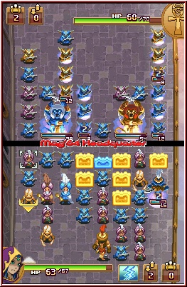 Um diese immer zur Verfügung zu haben, greift hier nun das Ressourcen System. Neben Geld spielen Steine und Kristalle eine Rolle, mit denen man Nachschub in den entsprechenden "Shops" kaufen kann. Um euch noch ein wenig zu mehr zu Verwirren, sei angemerkt das auch Farben eine wichtige Rolle beim Thema Einheiten spielt. ;-)) Aber ich will es nicht übertreiben und nehme euch mal mit in einen typischen Kampf in Might & Magic. Denn auch dieser Punkt ist im Rollenspiel Universum eher die Ausnahme, was die Umsetzung angeht. Kämpfe an sich gehen hier nicht per Zufall vonstatten, sondern Gegner sieht man. Kommt es zu einem Kampf gibt es neben dem Ziel des Kampfes, was meist die Vernichtung des Gegners bedeutet, auch eine Anzeige wie stark dieser ist und welche Einheiten er einsetzt. Keine Sorge, auch der Gegner kann maximal nur auf Level 10, bzw. 5 bei den Einheiten leveln. Beginnt ein Kampf spielt sich alles auf einem eher Puzzle ähnlichem Spielfeld ab. Identisch von der Aufteilung her sieht man die eigenen Truppen auf dem Touch Screen, während der Gegner im Top Screen abgebildet wird. Um zu Agieren steht beiden ein jeweils 6x8 Felder großes Spielfeld zur Verfügung, das man aber erst im Verlauf einer Handlung voll ausnutzt. Denn je geringer das Level, um so weniger Truppen könnt Ihr maximal befehligen. Gesteuert werden kann das Ganze nun wahlweise über eine Pensteuerung, oder die Kreuz/Tastenvariante. Aufgrund des Rundenbasierten Gameplays und ohne das man direkten Zeitdruck hat, macht die Kreuz/Tasten Variante auf Dauer mehr Sinn. Bin zumindest damit besser zurecht gekommen. Bevor man nun loslegt, interessieren zunächst ein paar wichtige Anzeigen im Kampfbildschirm. Jeweils am oberen und unteren Rand findet man die HP Leiste der beiden Kontrahenten. Ein Kampf kann nur gewonnen werden, wenn man diese auf Null bringt. Nicht durch das Vernichten gegnerischer Einheiten. Diese sind nur Mittel zum Zweck, wenn auch ein wichtiges. ;-) Daneben findet man 3 wichtige Anzeigen. Zum einen verfügt jeder Held über eine spezielle Zauberanzeige, den man durch gelungene Aktionen nach und nach füllt. Des Weiteren gibt es eine Anzeige für die aktuell verbleibenden Züge innerhalb der Runde und zu guter letzt die Anzahl der Nachschub Truppen, die man Rufen kann. Nehmen wir mal einen gut gelevelten Helden, der 30 Einheiten befehligen kann. Startet ein Kampf, werden diese auf dem Spielfeld platziert. Dabei besetzen die Basiseinheiten 1 Feld, die die Eliteeinheiten 2 und die Meistereinheiten derer 4 Felder. Wichtig zu Wissen, das ihr diese nicht Zwingend mitnehmen müsst. Ihr könnt neben den 3 möglichen Basistypen auch nur die beiden verfügbaren Eliteeinheiten auswählen und lasst die Meistervarianten einfach zuhause. Hier spielt dann auch eure Spielweise eine große Rolle.