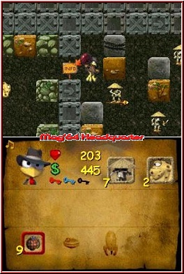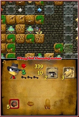 Neben den Sandblöcken warten ferner Felsformationen, die vom Zahn der Zeit gezeichnet sind, auf ihre Zerstörung. Allerdings darf das Moorhühnchen diese auch verschieben – nicht nur zum Füllen von Lücken, sondern auch, um Widersacher außer Gefecht zu setzen. Denn um eine Mission zu erfüllen, bedarf es nicht, wie landläufig üblich, einen Ausgang zu erreichen, sondern Ihr müsst alle Gegner ausschalten, um ein Level voranzukommen. Daher können Felsblöcke auch dazu genutzt werden, Opponenten zu plätten und dadurch auszuschalten. Die Unholde laufen in wilder Weise durch die Gänge, immer auf der Suche nach etwas Leckerem zu fressen. Intelligent agieren sie zwar nicht, daher dürfte es oftmals gar nicht so schwer sein, im rechten Moment deren virtuelles Lebenslicht auszuknipsen. Allerdings – und das ist die Schwierigkeit des Spieles – sind Eure Aktionen des Öfteren kaum im Voraus vorherzusehen: Habt Ihr einen Sandblock zerstört, krachen die darüber liegenden Blockmassen nach unten, so dass Ihr teilweise nur noch mit Hilfe von Granaten und Minen vorwärts kommt. Poröse Felsschichten lassen sich in ihre Einzelteile zerlegen, selbstverständlich auch angreifende Rivalen im Nu ausschalten. Giftkocher funktionieren in ähnlicher Weise und explodieren bei Kollision mit anderen Gegenständen, dienen aber auch dazu, bislang versperrte Wege zugänglich zu machen und Gegnergruppen auszuschalten. Leider zeigt sich der Titel relativ innovationsarm, was nicht nur an den größtenteils immer ziemlich ähnlich aufgebauten Levels liegt, sondern auch daran, das der Schwierigkeitsgrad wegen unvorhergesehener Situationen stark anzieht. Außerdem ist die Optik nicht sonderlich spektakulär geraten, das Spielprinzip bietet nur bedingt Abwechslung.