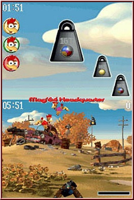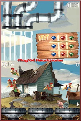 Ein zweiter Spielmodus beinhaltet ebenso das Abschießen der Flattertiere, allerdings mit verschiedenfarbigen Gewichten. Auch die Moorhühner sind jeweils anders gekleidet, dementsprechend solltet Ihr Euch an deren Outfit orientieren, um das passende Ziel ins Visier zu nehmen. Mit dem Touchpen stellt Ihr den Schusswinkel ein, ebenso steuert Ihr hiermit die Beschleunigung des Geschosses. Ziel ist es, jedem Moorhuhn drei Gewichte zu verpassen, so dass es nicht nur abstürzt, sondern Eurem Konto einen wahren Punkteregen beschert. Gelingt es hingegen nicht ein Huhn mit dem Gewicht der entsprechenden Farbe zu treffen, ergreift es die Flucht und ward nimmermehr gesehen ;-) . Sechs Minuten bleiben Euch für dieses Unterfangen. Zwar kommt hier die locker-flockige Gameplay-Weise des Originals zu keinem Zeitpunkt zustande, dennoch dürfen Fans der tierischen Gacker-Tiere auch hier einen Blick hineinwerfen. Die dritte Möglichkeit Moorhühner, respektive Edelsteine, vom Himmel zu holen, gestaltet sich folgendermaßen: drei Trichter befinden sich am unteren Rand des Touchscreens, darüber hinweg fliegen unzählige "Irokesenträger". Auf einem Bretterverschlag befindet sich eine Kombination verschiedenfarbiger Edelsteine, die Ihr nun dergestalt in den Trichtern sammeln müsst, um Bonuspunkte abzustauben. Anfangs reichen gleichfarbige Edelsteinreihen in einem Trichter, später gibt's Extrapunkte nur noch für diagonal angeordnete Edelsteinfarbenkombinationen. Als erschwerendes Hindernis wurde ein schleimiger Häusleträger, besser bekannt als Schnecke, über den Trichtern platziert, der mit aller Mühe die Klunker davon abhalten will, als Nahrung im Schlund des Trichters zu verschwinden.