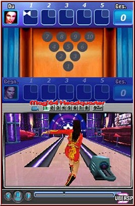 Unser erster Blick fällt auf „Midnight Bowling", welches in gewisser Weise an „Wii Sports" erinnert. Nur dieses Mal eben nicht mit der Wii-Fernbedienung, sondern mit dem Stylus. Und weil die Handheld-Umsetzung wesentlich mehr Umfang bietet als die TV-basierende Variante, werdet Ihr auch noch nicht nach wenigen Minuten den vollkommenen Überblick besitzen. Da wäre zum einen der „Bonusmodus", in dem Ihr alle zur Verfügung stehenden Clubs inspizieren dürft. Wohin entführt Ihr Eure Mitspieler als nächstes? Vielleicht in den Edelschuppen von nebenan oder doch lieber ins mondäne „Bicesilva"? Eine ganze Palette an Challenges stehen Euch im Laufe des Spieles zur Auswahl bereit, allerdings solltet Ihr zuvor Euer Glück während eines Kurzspiels versucht haben (inklusive Charakter- und Outfitwahl!), ein wenig die Bowlingkugel zur Probe gerollt haben oder für das erste „Turnier" eingeschrieben sein. Die Steuerungsmechanik funktioniert einwandfrei, selbst ein nachträglicher Drall darf der Kugel mit auf den Weg gegeben werden.