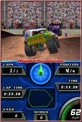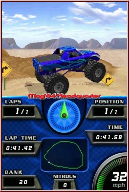 Die Strecken in den 5 Umgebungen reichen nun von recht sauber zu fahrenden Wüstenpisten bis hin zu verwinkelten und mit Geröll und Hindernissen gespickten Strecken. Richtungspfeile und Fähnchen zeigen euch wo das ganze langgeht und die Hats beginnt. Soweit die positiven Aspekte des Gameplays. Kommen wir zu den negativen Dingen und den Gründen warum die DS Version nicht überzeugt. Zum ersten wird die eigentlich gute Steuerung durch mehrere Dinge kaputt gemacht. Das beginnt vor allem bei einer arg übertriebenen Kollisionsabfrage. Kleinste Büsche, die man ab und zu in den Pisten verteilt hat sorgen bei Berührungen oft für abruptes Stoppen des Boliden oder gar den lustigsten Stunts. Ungewollt kann man das Kapitel auch bei Gegner Kontakten übernehmen. Zu oft sorgen selbst kleinste Berührungen für extreme Manöver, die man selten austangieren kann. Sieht zwar spektakulär aus wenn 4 Trucks wild durch die Gegend wirbeln, nur mit Rennaction hat das nur noch wenig zu tun. Gottseidank und das war meine größte Befürchtung nach den GBA Versionen von Skyworks ist die Framerate absolut sauber. Auf der anderen Seite ist der Gamespeed alles andere als hoch. Natürlich sind es keine Formel Renner, aber etwas flinker hätten sie auch fahren können. Man umging das Problem sicher auch die Streckenführungen. In der Wüste mit wenigen Randdetails geht es zwar auch mal länger geradeaus. Aber gerade wenn man in den Arenen fährt kommt eine unsinnige Kurve nach der anderen, die eigentlich mehr für BMX Räder geeignet wären als für Trucks die vielleicht auch noch nebeneinander her fahren. Der hier auch auftretende Grafikaufbau macht das ganze dann auch nicht einfacher. Größter Klops ist aber der Schwierigkeitsgrad des Spiels im gesamten. Könnte man sich mit den angesprochenen Fehlern noch arrangieren ist die Schwierigkeit des Spiels viel zu niedrig angesetzt. Vor allem dann wenn man einmal einen Fuß im Shop hat. Denn baut man seinen Boliden nach dem Erhalt von Preisgeld stetig aus hat man nie ein Problem die Rennen zu gewinnen. Es wird ab den Kursen 3 Varianten so zunehmend langweilig. Eine Runde ist meist Action und die angeprochenen Schwächen sorgen für manchen Fehler. Ist man aber einmal vorn und hält nicht gerade an um auf die anderen zu warten gewinnt man locker jedes Rennen.