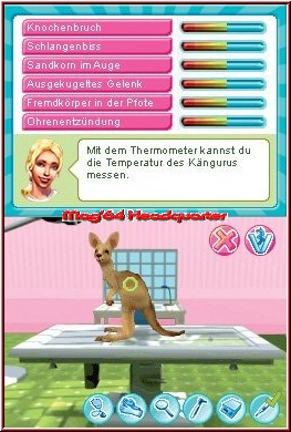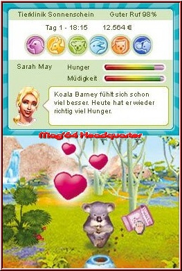 Zunächst solltet Ihr ein Profil erstellen mit dem Ihr nach Australien reisen könnt. Anders als bei den Vorgängern wurde die damals noch obligatorische Reiteinlage auf einem Pferd ersatzlos gestrichen. Nur noch das Hauptspiel steht zur Verfügung. Innerhalb der „Optionen" dürft Ihr leider auch nicht viel mehr machen, als die Lautstärke der Soundausgabe zu regulieren. Weder gibt es Minispiele, noch innovative Stylus-Einsätze. Aber von Anfang an: Nachdem Ihr rund 20 Stunden mit dem Flugzeug unterwegs wart, seid Ihr nun endlich in Australien angekommen, in Eurer Praxis von welcher Ihr aus die Steppe, die Eukalyptuswälder und die Berge betreut. Besser gesagt deren Bewohner. Wie üblich navigiert Ihr die Protagonistin mithilfe des Touchpens durch die zeitweilige Unterkunft. Ein Wildhüter steht Euch jederzeit zur Seite und erklärt Euch erste Abläufe wie es in der Wildnis Australiens zugeht. Von Eurem „Zuhause" aus geht Ihr online einkaufen, da die nächste Stadt, in der dies möglich wäre, viel zu weit entfernt liegt. Demnach bietet sich das Online-Geschäft bestens an. Mit ein paar Klicks habt Ihr den virtuellen Einkaufswagen mit tierischer Nahrung für Kängurus, Wildpferde, Numbats, Koalas, Dingos und Wombats gefüllt, auch medizinische Ausstattung erhaltet Ihr von dort. Ob Ihr nun eine Salbe benötigt, die Pflaster ausgegangenen sind oder Verbände fehlen – im Internet-Shop erhaltet Ihr so ziemlich alles. Jedoch muss zunächst etwas Geld in die Kasse kommen. Geld, das nur während der Behandlungseinsätze verdient werden kann.