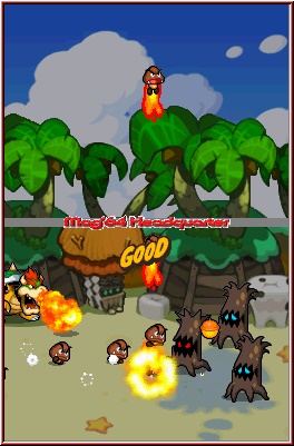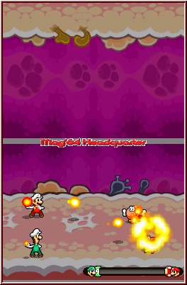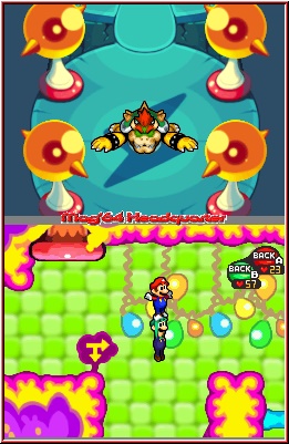 Er springt selbsttätig auf den Gegner und zieht dem Gegner ohne euer zutun einen gewissen Wert an Lebensenergie ab. Drückt Ihr aber im richtigen Moment die Charaktertaste könnt Ihr bei perfektem Timing wesentlich mehr abziehen und den Gegner so logischerweise schneller besiegen. Das gleiche gilt in der Verteidigung wenn Gegner auf euch zulaufen. Springt man hier im richtigen Moment, so kann man praktisch einen Konter ausführen ohne selber Energie zu verlieren. Dabei geht der Kampf solange bis entweder alle Gegner eliminiert sind oder Ihr beide Charaktere verliert. Die Umsetzung der eigenen Team Attacken sind nicht mehr mit den Bruderpunkten verknüpft, sondern hier je nach Angriffsart verschieden. Wählt man z.b. die grünen Panzer als Attacke aus, so kickt man diesen von Mario zum Gegner und von dort zu Luigi. Ihr müsst nun die eigene Charaktertaste genau drücken um den Panzer wieder zurück zum Gegner zu pfeffern. Nach einem Kampf bekommen beide Charaktere nun Erfahrungspunkte in verschiedenen Bereichen und der RPG Teil beginnt. Neben Level Up's steigen so der maximale HP Wert, die Angriffs- und Verteidigungskraft. Dazu kann man in einem kleinen Bonusspielchen einen Wert der eigenen Wahl mit einer Art Slot Machine weiter pushen. Hier greift das RPG Prinzip voll und ganz und ist danach sofort nachvollziehbar. Man merkt dies im nächsten Kampf wenn man mit dem gleichen Angriff mehr Punkte beim Gegner abzieht. Soweit das gewohnte Grundgameplay mit den 2 Charakteren wie wir es ja schon vom Vorgänger her kennen. Die Würze kommt dann, wenn hier nun Bowser ins Spiel kommt und man das erste mal die Abhängigkeiten zwischen den beiden Truppenteilen erlebt. Einfach gesagt müssen, um Bowser aufzuwecken, dessen Nerven im Körper wieder reanimiert werden. Also begeben sich Mario & Luigi im Körper an dafür vorgesehene Orte, die hier normale Level darstellen, an dessen Ende man in Form kleinerer Spielchen dies z.b. auslöst. Der ganze Körper von Bowser ist so angelegt, und man bekommt im Verlauf immer neue Bereiche des Körpers Freigeschaltet, die man danach besuchen kann. Auch hier unterstützt euch Chippy. Sobald Bowser nun einmal wach ist, gilt es wieder einiges an Sequenzen zu verfolgen. Schließlich muss auch der Panzerträger erstmal davon überzeugt werden, was in ihm abgeht und das die dort umherwuselnden Charaktere fast nur sein Bestes wollen. ;-)