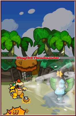 Sobald Ihr hier nun ein neues Abenteuer beginnt, werdet Ihr natürlich auch in die Story Geschehnisse eingeführt und es dauert mal wieder schier ewig, bis man selber Hand anlegen kann. Aber Dank der Humorvollen Präsentation und auch bedingt durch die reine Neugier des Spielers, wird das ganze mal wieder nicht langweilig. Für Eingeweihte Spieler des Vorgängers ist zunächst vieles durchaus sehr bekannt und man kommt mit dem eigentlichen Gameplay äußerst schnell zurecht. Denn bedingt durch den nun steuerbaren Charakter Bowser, ist das Grundprinzip nicht groß anders wie mit den Mini Ausgaben der Klempner im Vorgänger. So spielt sich das Game hier jeweils für beide Parteien getrennt auf dem Top und Touch Screen ab, wobei natürlich die Feinheiten näher zu Beleuchten sind. Sonst bräuchten wir ja auch keinen Test. ;-) Dabei beginnt das Spiel zunächst relativ einfach und führt Neulinge in diesem Genre äußerst behutsam an die Dreierbande heran. Nach der Einführungssequenz beginnt alles mit Mario, der zunächst noch allein im Inneren von Bowser gefangen ist. Bowser selber liegt nach der Saugattacke noch Ohnmächtig im Wald herum und muss erstmal aufgeweckt werden. Dazu braucht Mario seinen Bruder und macht sich hier erst mal auf die Suche. Es gibt zu Beginn weder Menus noch irgendwelche Team Action und die ersten „Meter" des Spiels sind eher ein 1P Jumper alter Machart. Sobald Mario seinen Bruder gefunden hat, startet so langsam das altbekannte Gameplay, das diese Serie auch so unverwechselbar gemacht hat. Im groben geht es nun darum das Mario & Luigi mit Hilfe von Chippy dafür sorgen, dass sich Bowser in der realen Welt auf der Oberfläche durch die enthaltenen Welten auf den Weg zu seiner Festung macht. Denn auch die ist im Fokus des Schurken Krankfried. Dabei behalten sie aber auch ihr Ziel im Auge, Peach zu finden und etwas um die Metabowlie zu besiegen. Je weiter man im Spiel nun kommt, um so mehr Abhängigkeiten zwischen den Abenteuern wird es geben. Spielerisch gibt es von nun an wieder die berühmten 2 Bereiche. Zum einen der reine Action Modus, der wie schon erwähnt mit Mario & Luigi auf dem Touch Screen abgeht und bei Bowser auf dem Top Screen Gegenstück. Die zweite Variante ist wieder das RPG und Rundenbasierte Kampf Gameplay gegen unzählige Gegner. Dazu wechselt das Geschehen bei den 3 Helden jeweils auf eigene Battle Screens, die dann auf beide Bildschirme ausgedehnt werden.