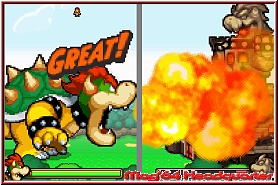 Schauen wir zunächst mal auf die Aktionsmöglichkeiten im Action Part der Charaktere. In der Grundform rennen Mario & Luigi automatisch hintereinander her. Hier ist Mario dann auch immer vorn und Luigi hinten dran. Dabei ist im Action Part die Sicht nun etwas anders als früher. Im Fall von Bowser gewohnt schräg von oben auf das Geschehen und bei den beiden Klempnern diesmal als 2D Sicht wie in alten Jump‘n Run Zeiten. Wie schon im Vorgänger kann man beide Klempner ja nicht trennen und die Steuerung zeigt wieder ihren speziellen Touch. Hier kommen nun die A und B Tasten zum Zuge. Je eine Taste für einen Charakter, was man auch Screen so zu sehen bekommt. Drückt Ihr A springt Mario und bei B Luigi. Geht es über Treppen nach oben müsst Ihr also einen immer wieder nachziehen, oder drückt halt beide Tasten gleichzeitig. Sieht lustig aus, klappt aber perfekt. Ihr könnt so z.b. an die berühmten Würfel in der Luft springen um Tipps und Münzen zu erhalten oder auch um zu Speichern. Jederzeit ist das nicht möglich und Ihr müsst die entsprechenden Speicherwürfel finden. Allerdings ausreichend verteilt. Doch das ist wie gesagt nur ein Teil des ganzen. Wie bei allen Aktionen werden die wichtigsten Sachen in kleinen Tutorials umgesetzt, so das euch nichts entgeht. Das gilt für den Action Teil als auch für den Kampf Modus. Dieser ist ebenfalls zu Beginn nichts Neues in dem Sinne. Trefft Ihr z.b. auf umherwuselnde Gegner, die meist der Nintendo Welt entstammen, so schwenkt der Bildschirm um auf den Battle Screen. Hier stehen sich die Kontrahenten im Touch Screen gegenüber, wobei der Kampf nun auf beide Screens ausgedehnt wird. Links Mario und Luigi, während rechts der oder die jeweiligen Gegner Aufstellung nehmen. Auch hier bleibt zunächst alles beim A und B Prinzip. Sämtliche Aktionen Mario's werden mit A ausgeführt und bei Luigi erneut mit der B-Taste. Im Verlauf des Spiels erhaltet Ihr weitere Aktionsmöglichkeiten um hier zu agieren. Dabei geht dies Rundenbasiert vonstatten, was den hier fehlenden Pausenmodus relativiert. Seid Ihr am Zuge scrollt Ihr durch ein Menu und könnt nun je nach Fortschritt im Spiel verschiedene Möglichkeiten anwählen. Wahlweise mit mehreren Angriffen einen Gegner mit einem Charakter allein angreifen, zusammen Angriffe starten, Items einsetzen um z.b. die Gesundheit zu regenerieren oder um zu Fliehen, was allerdings mit viel Münzenverlust verbunden ist. Jetzt kommt das zum Tragen was auch in Paper Mario den Spaß ausmachte. Das Timing im Kampf, das der Spieler voll kontrolliert. Wählt Ihr z.b. eine Sprungattacke so wählt man einen Gegner aus und Mario legt beispielsweise los.